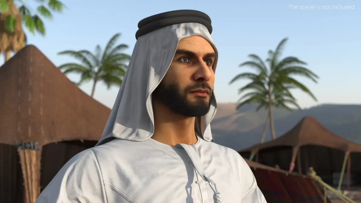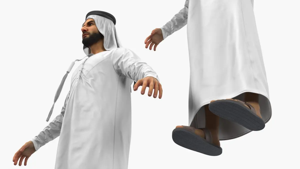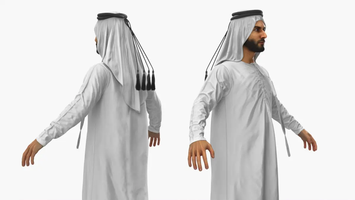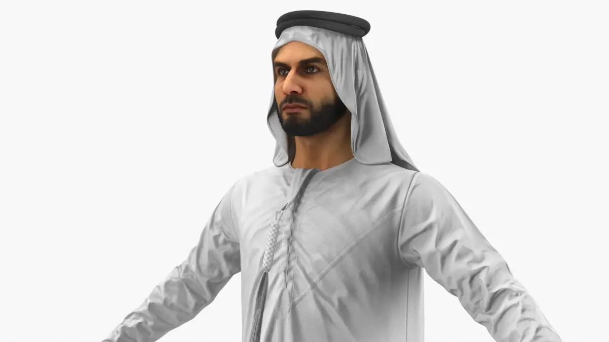 Arabian Man in Kandura A Pose White is a three-dimensional model of Middle Eastern character in kandura and keffiyeh, which are traditional Arabian clothing garments.