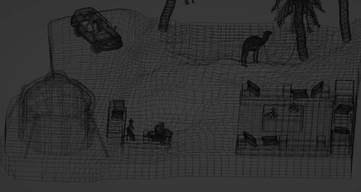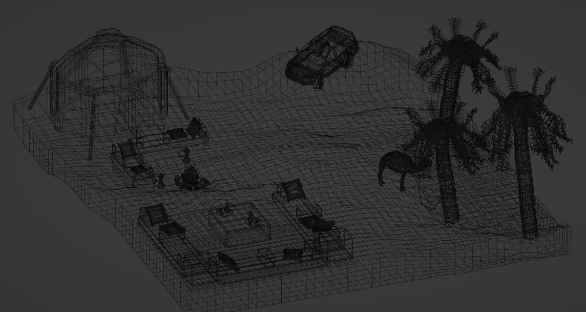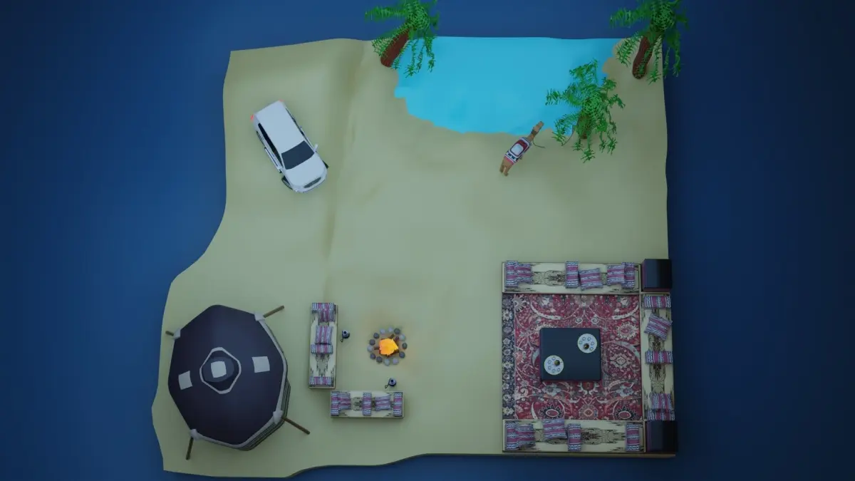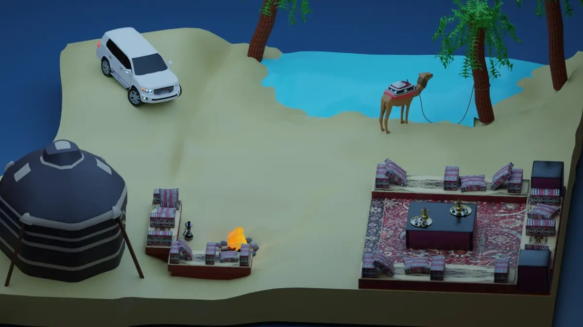 Arabian Nights Diorama 3D Model. a mix of activties that you can do when going to a Desert Safari in the arabian countries. The Model includes a Tent, 2 Shishas, Toyota Land Cruiser 2015 J200 Model, Coffee Pot with Cups Set, Pillows and Carpet Seating, Bonfire, Oasis with Palm Trees and a Camel animal.