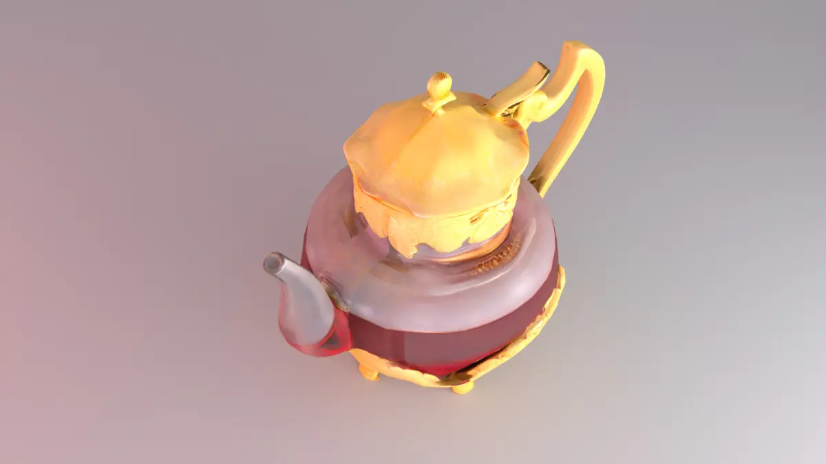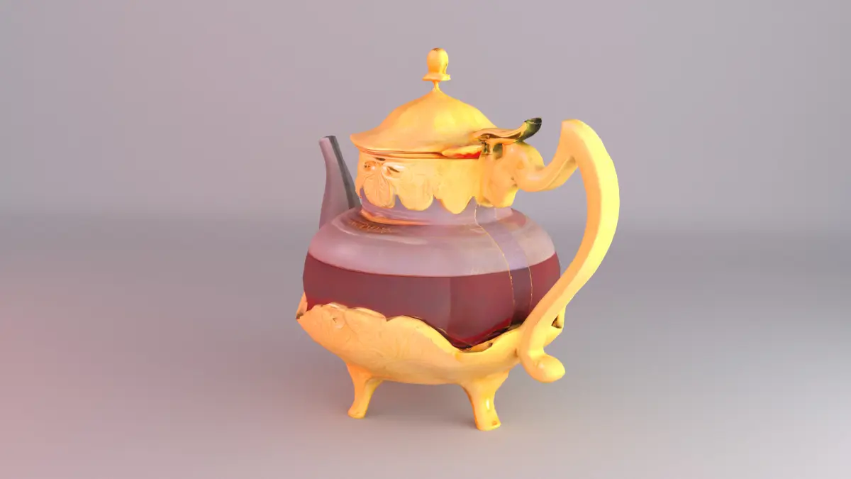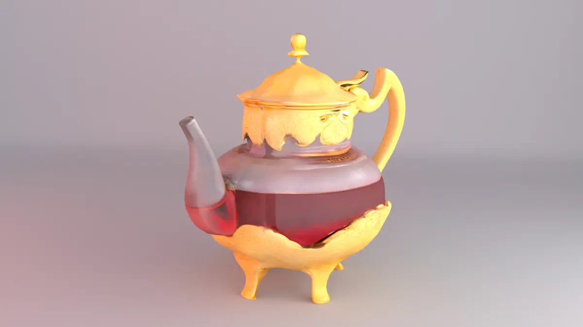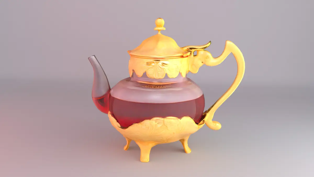 This high-quality 3D model represents a luxurious Arabian-style teapot, crafted with intricate golden ornamental details and filled with rich tea inside a transparent glass body. Its elegant design makes it ideal for cultural, hospitality, or interior decor visualizations.