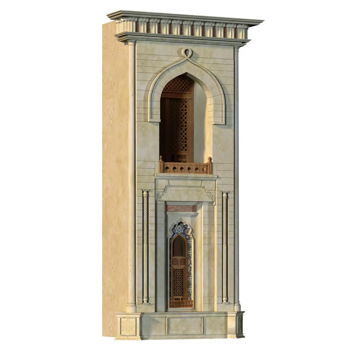 Name: arabic exterior facade element set 805Type: modelMid: Format: 3Ds Max 2019Export: FBXRender: VRay (6.x), Corona (11)Polys: 282379Verts: 322619Matclasses: Multimaterial,VRayOverrideMtl,VRayMtl,CoronaRaySwitchMtl,_CoronaPhysicalMtlUnits: CentimetersDimension: 208.43 x 123.62 x 421.07