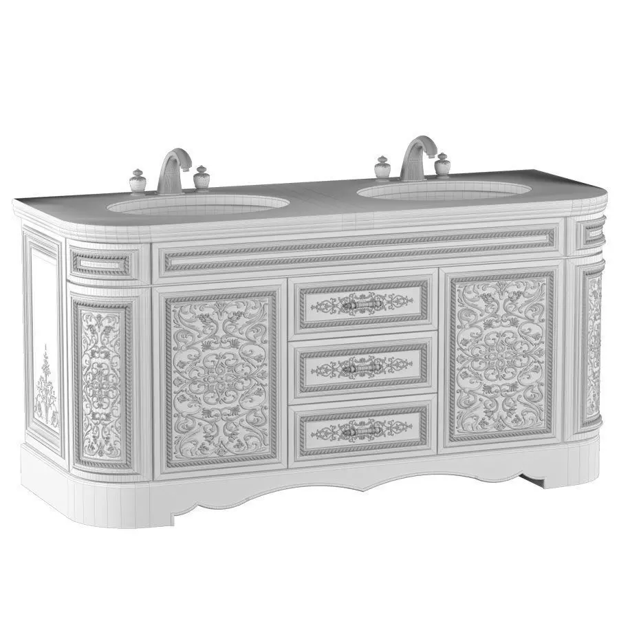 Cabinet with two washbasins in oriental style. Top in red Viola marble and carved walnut cabinet.