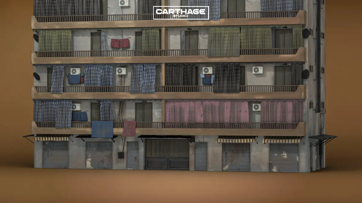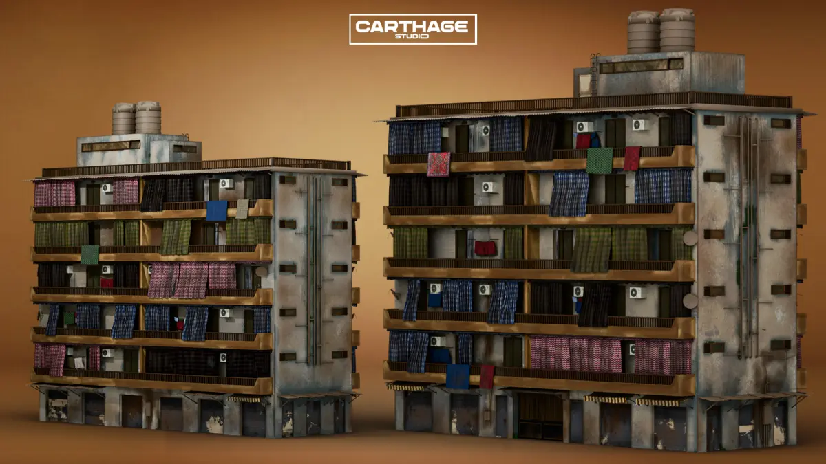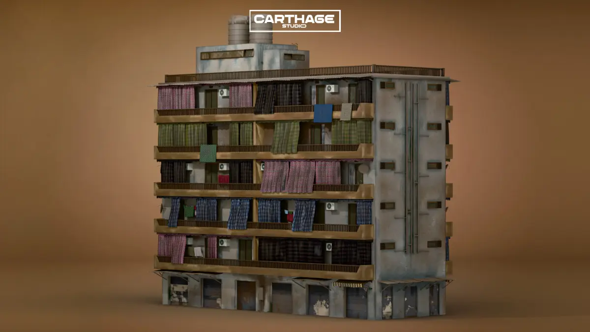 This high-quality 3D model showcases a mid-rise Arabic apartment building with a distinctly lived-in feel. Each balcony is adorned with colorful hanging laundry, air conditioning units, and weathered railings. The ground floor features multiple shuttered shops, adding an authentic commercial touch. Topped with water tanks and exposed piping, the structure’s aged textures deliver a realistic urban atmosphere. Optimized with PBR materials and clean topology, this asset perfect for building immersive Middle Eastern cityscapes.