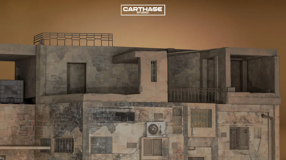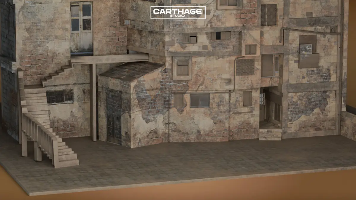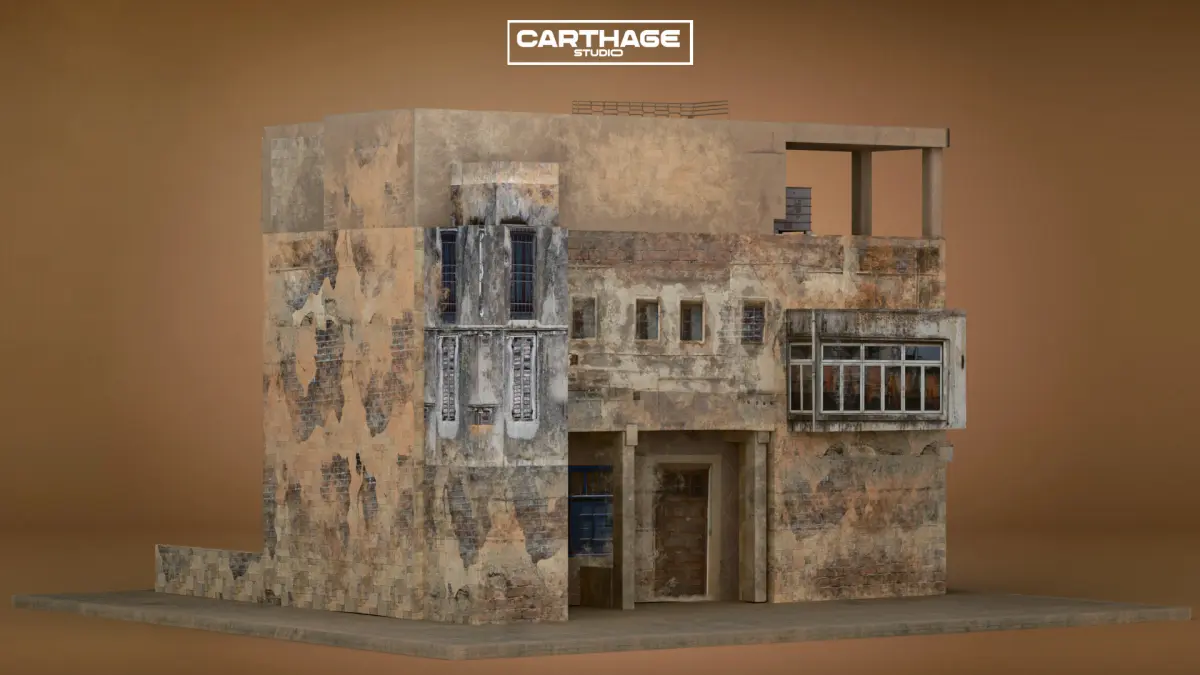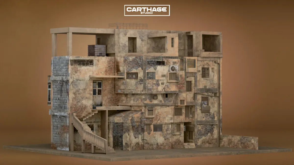 This high-quality 3D asset represents an old, low-income Arabic residential building with a heavily weathered and patched-up facade. The structure features exposed bricks, faded plaster, makeshift repairs, and an external staircase, capturing the authentic feel of aging urban environments. With open-air rooftop spaces and scattered air conditioning units, this model is perfect for adding realism to Middle Eastern cityscapes. The asset is optimized with PBR textures and efficient topology, making it ideal for real-time applications in Unity, Unreal Engine, or cinematic productions.