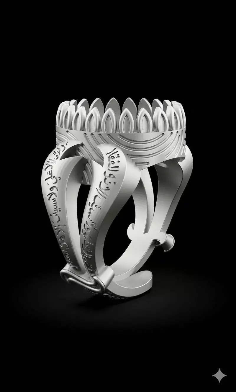 Arabic silver ring 3D model with a red carnelian gemstone and a sword-shaped band design. Features elegant Arabic Islamic ornamental engravings, suitable for cultural, spiritual, or historical projects. • Crown (stone) size: 20x15 mm • Inner ring diameter: 21 mm • Arabic / Islamic ornament design • Sword-inspired band style • Suitable for 3D printing, jewelry visualization, games, animation, CNC