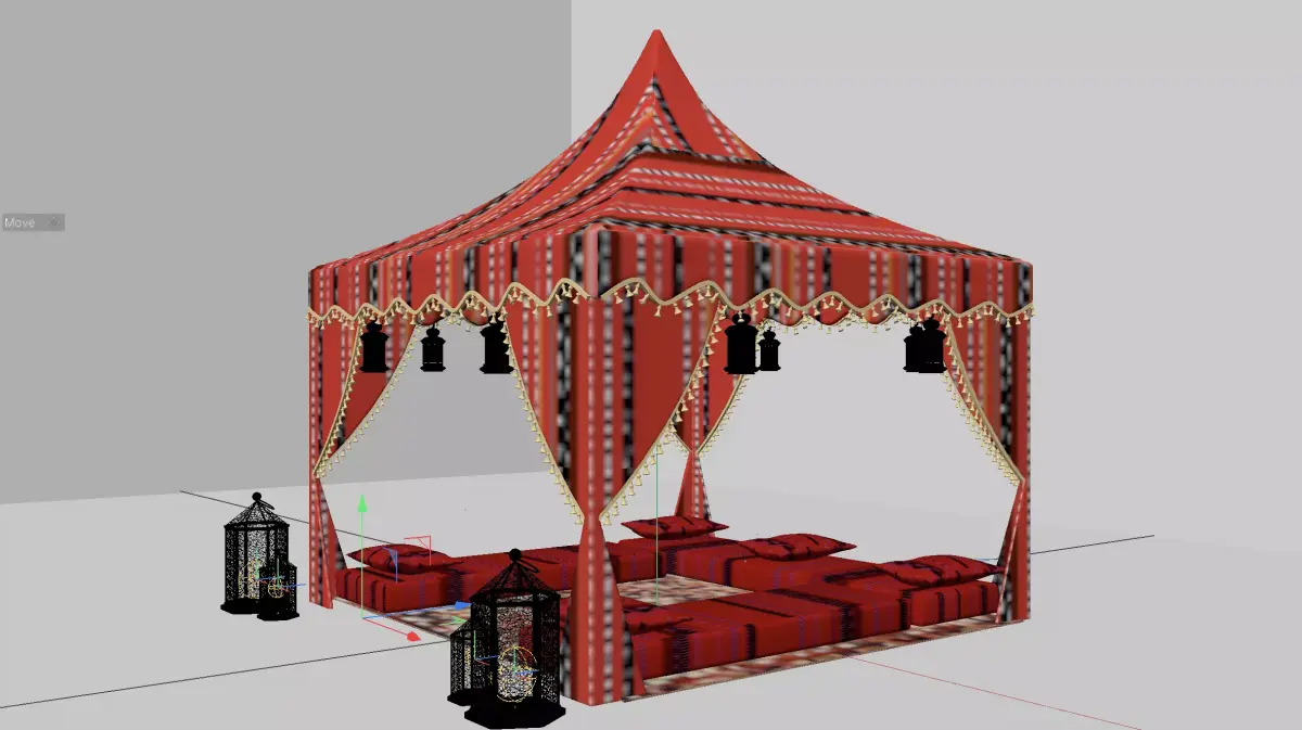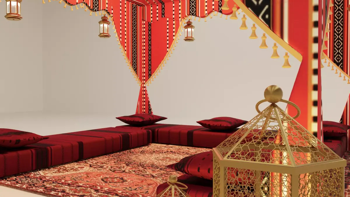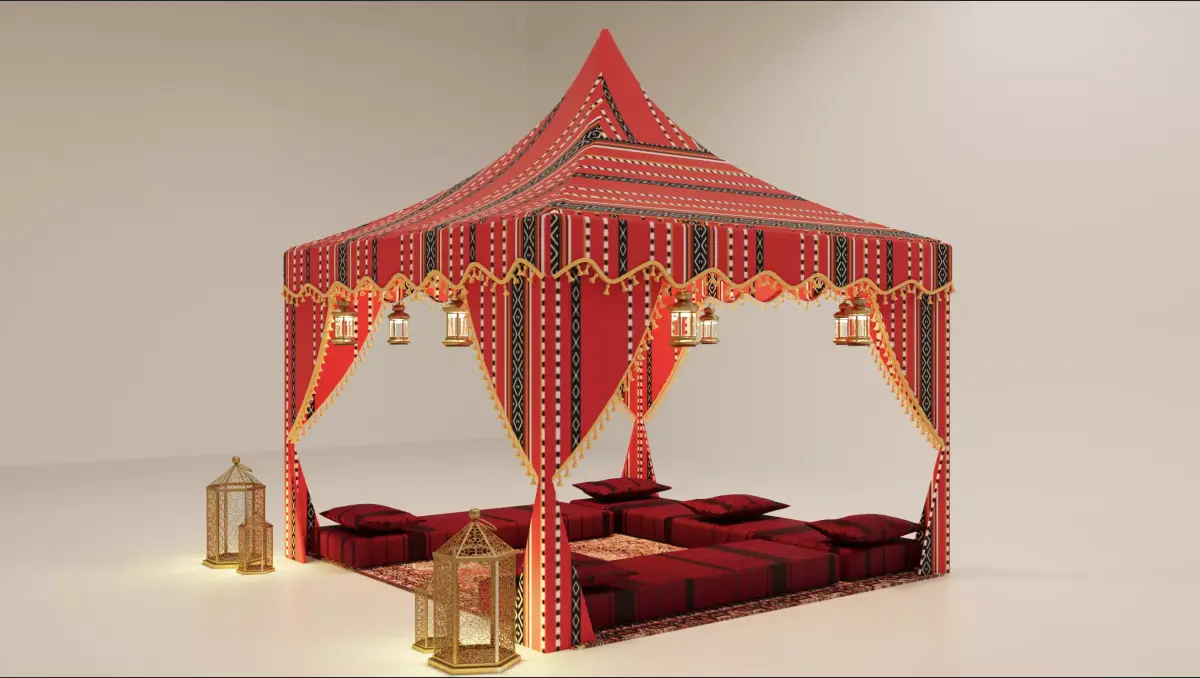 This 3D model represents a traditional Arabic Majlis tent inspired by Bedouin culture, featuring rich red patterned fabric, ornamental trims, hanging lanterns, floor seating, cushions, and decorative carpets. The design captures an authentic Middle Eastern ambiance, ideal for cultural events, Ramadan and Eid setups, exhibitions, luxury hospitality visuals, and heritage-themed environments.