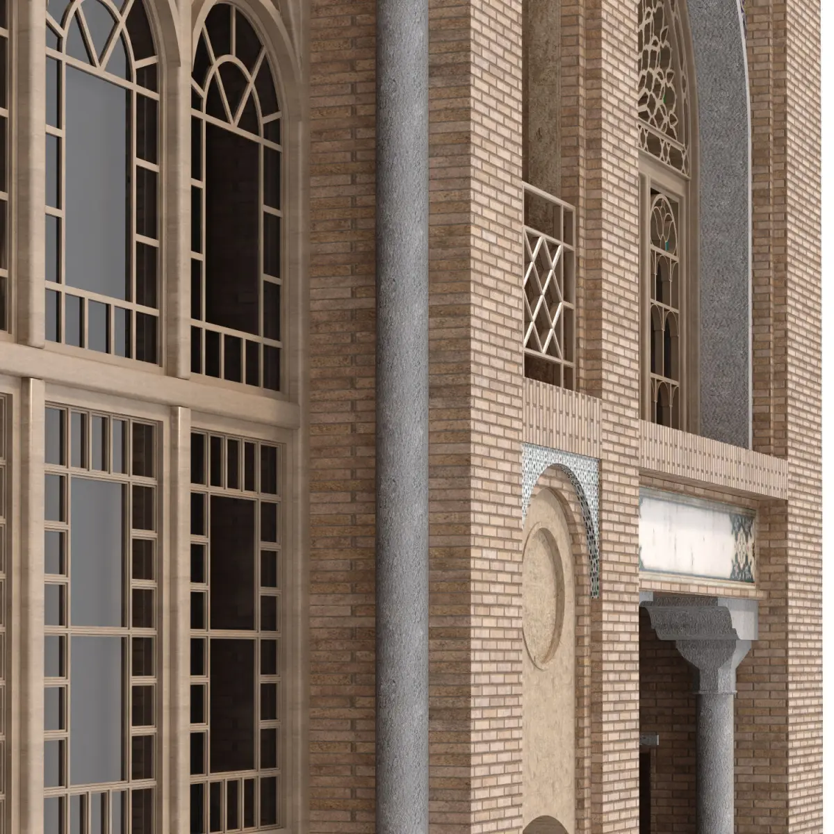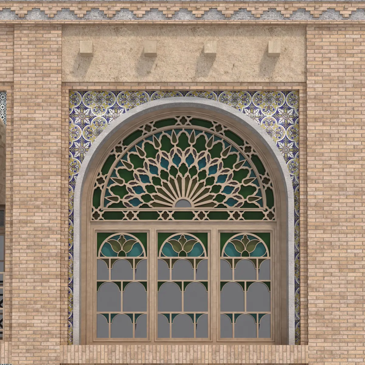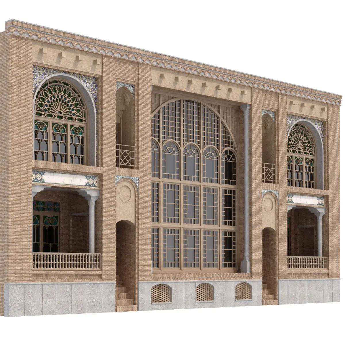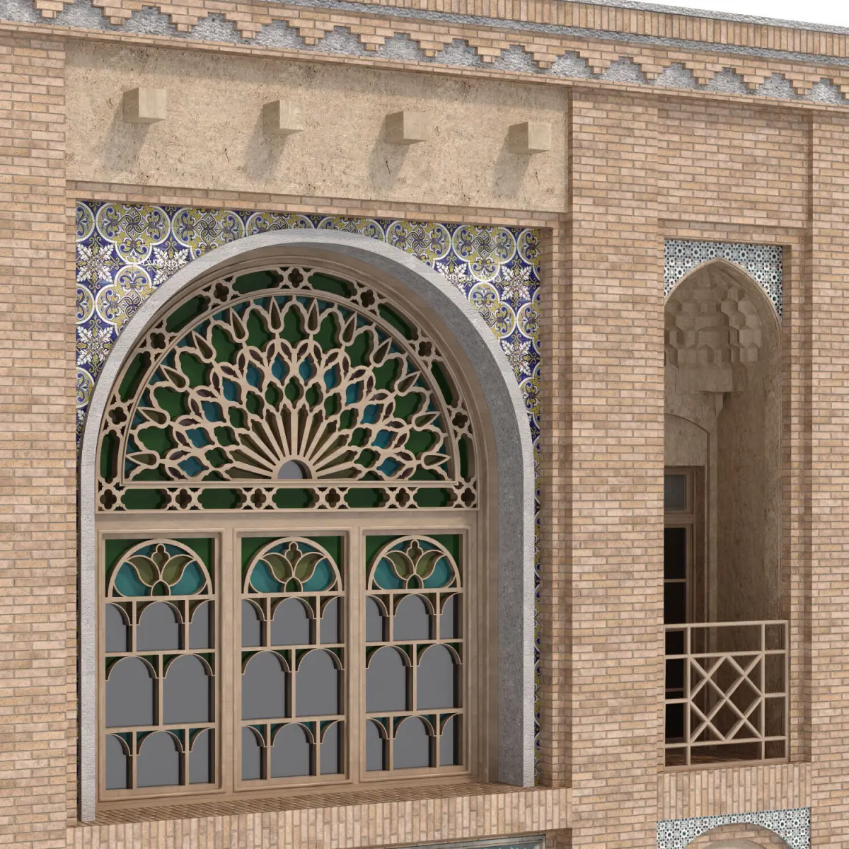 A highly detailed 3D model of a historic Qajar-style mansion, reflecting a blend of Persian, Arabic, and Turkish architecture. The exterior features intricate brickwork, arched windows, and traditional stained glass, making it ideal for architectural visualization, game environments, and historical recreations. The model is cleanly optimized with proper topology and UV mapping, available in 3ds Max and FBX formats, and fully compatible with V-Ray and Corona render engines.