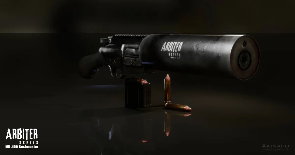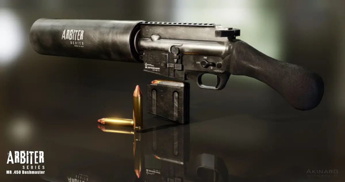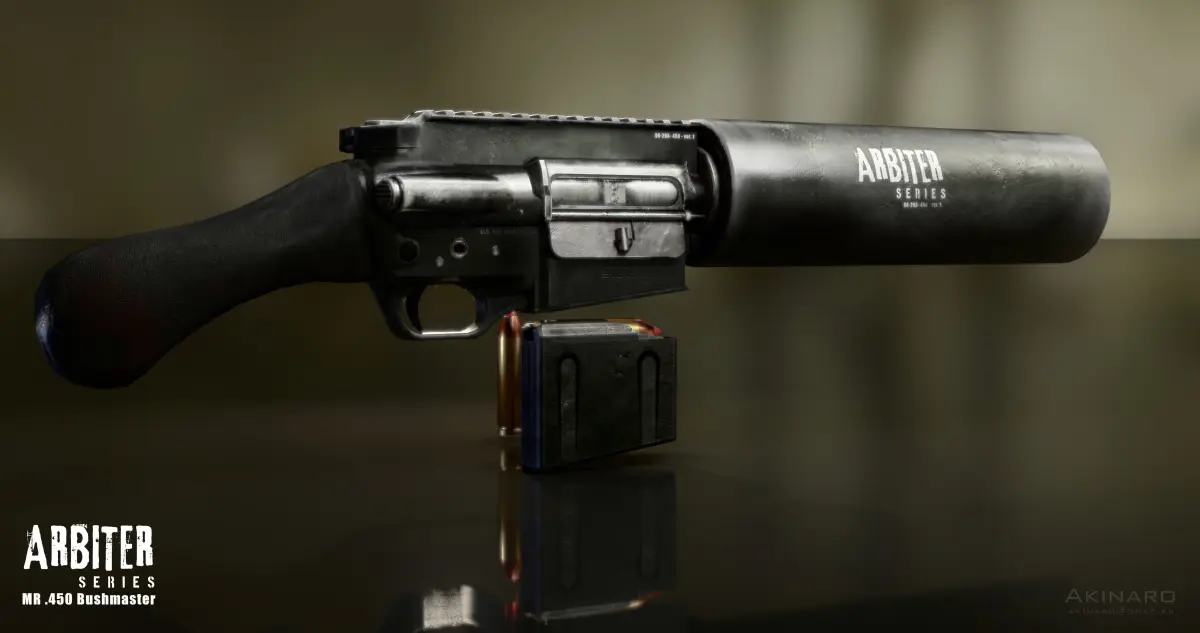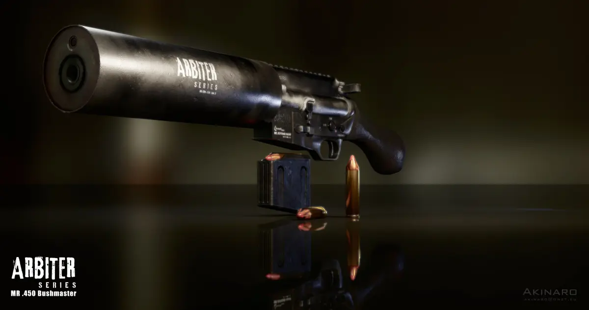 Technically this model of gun was... can shooter, but no one really want that so I modified tube to be semi-supressor-handguard-thing and i chambered it with 450 bushmaster, because its just nice caliber for such weird gun.Originally at the end of the grip there was some visible buffer tube but I realize that there should be no problem to cut it off and hide totally in grip for such big caliber...
