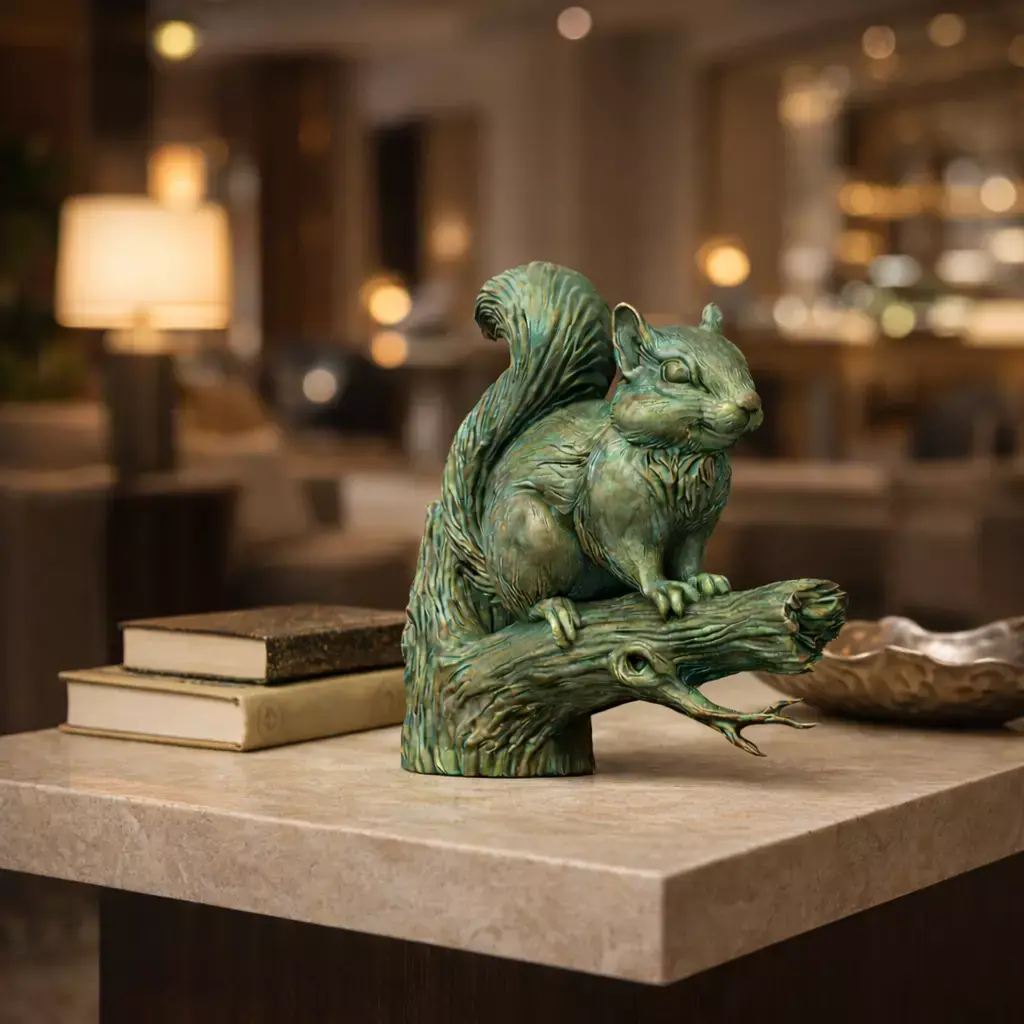 Key FeaturesFull 360° free-standing sculptureAged Verdigris Bronze finish (greenish patina metal look)High-detail squirrel anatomy & natural branch textureMuseum-style patina surface characterSuitable for bronze casting reference & CNC sculptureIdeal for luxury interior & architectural visualization