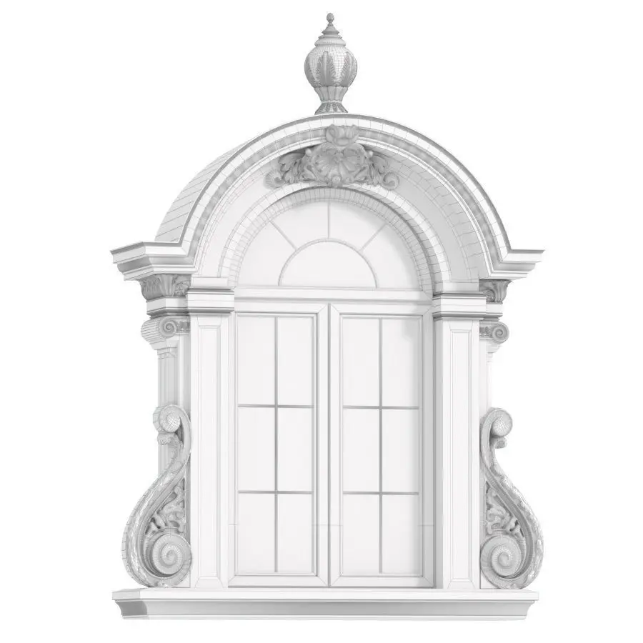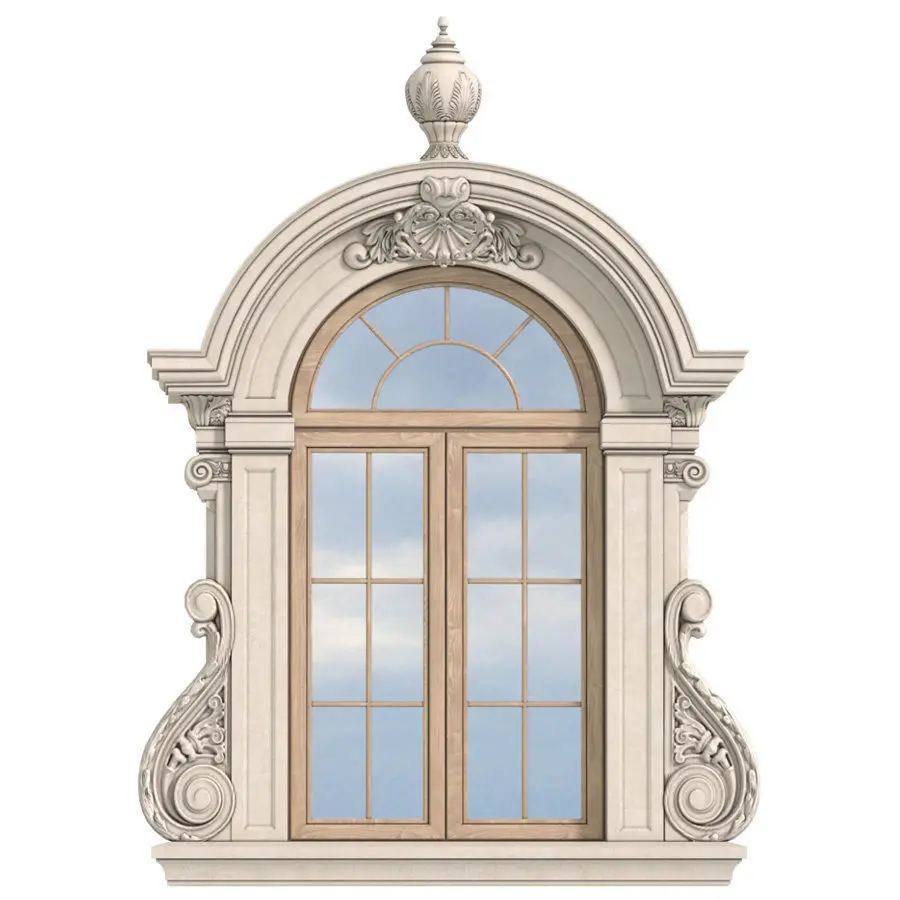 A classic external arched window with a frame (casing), capitals, a cartouche (bas-relief) and a vase.Facade decor for the exterior in a classic style.