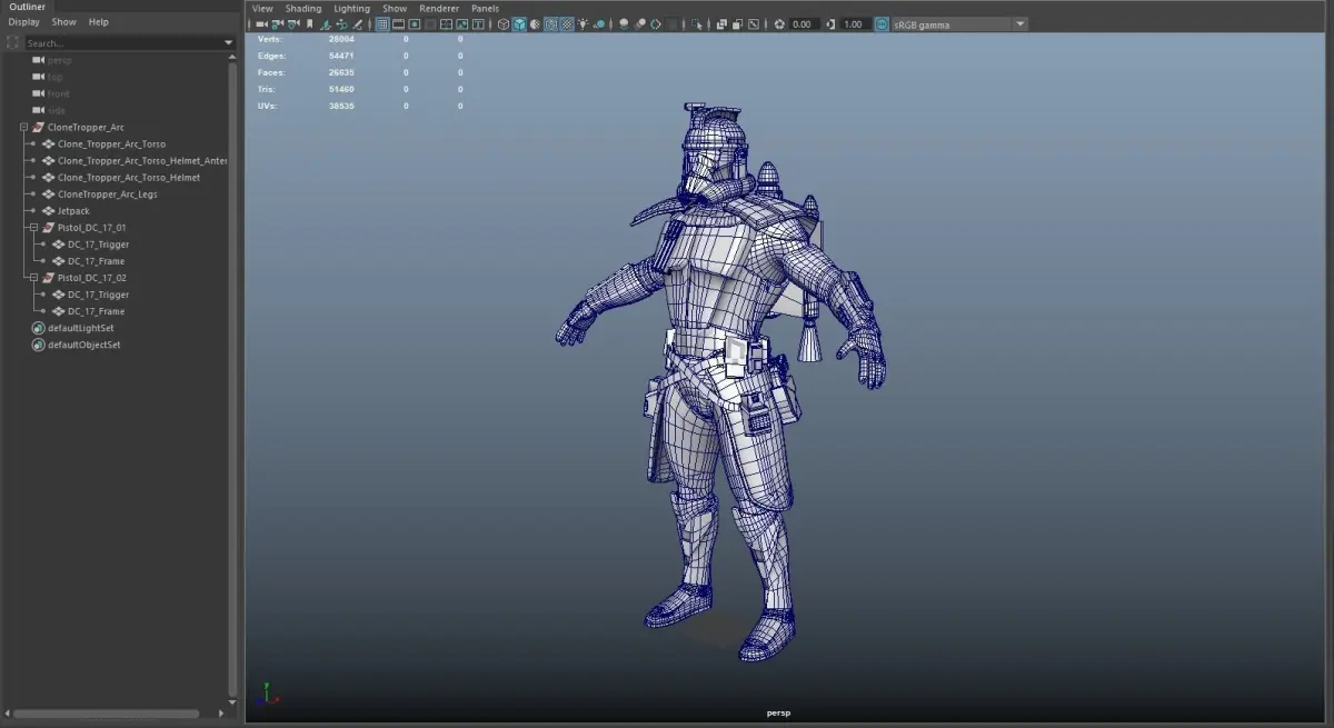 An Arc Clone Trooper Soldier ready for a Game Engine, I included the OBJ and FBX.MA And Blender file the model has 28004 verts, 54471 edges, 26635 polys, 51460 tris Textures are 4096 x 4096 legs, torso, pistol and jetpack. Each has diffuse, roughness, metallic, normal, and the necessary has emissive maps png if you need 3D Game Artist or 3D Printing artist I can do commission works.