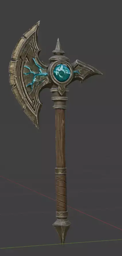 This fantasy arcane war axe is a highly detailed 3D weapon designed for games, cinematics, and concept art. The model features an ornate double-edged blade with carved runic patterns surrounding a glowing crystal core, giving it a powerful magical aesthetic. The handle combines aged wood and wrapped leather, complemented by metal fittings and a sharpened spike at the base for a rugged, battle-worn look.