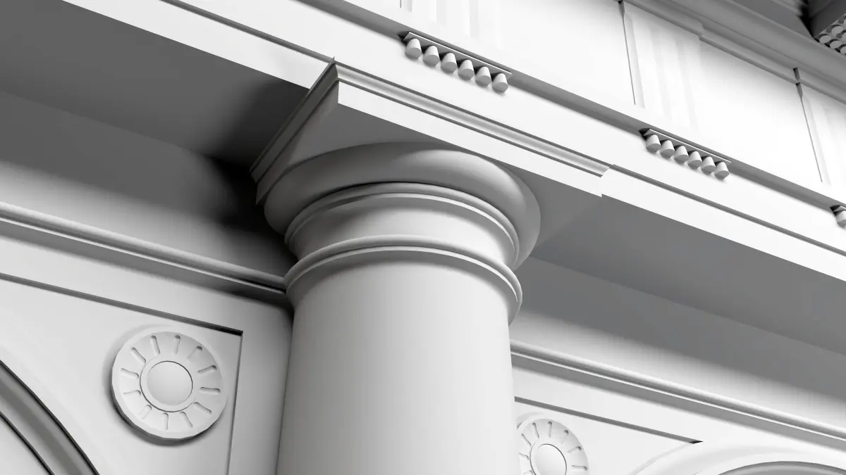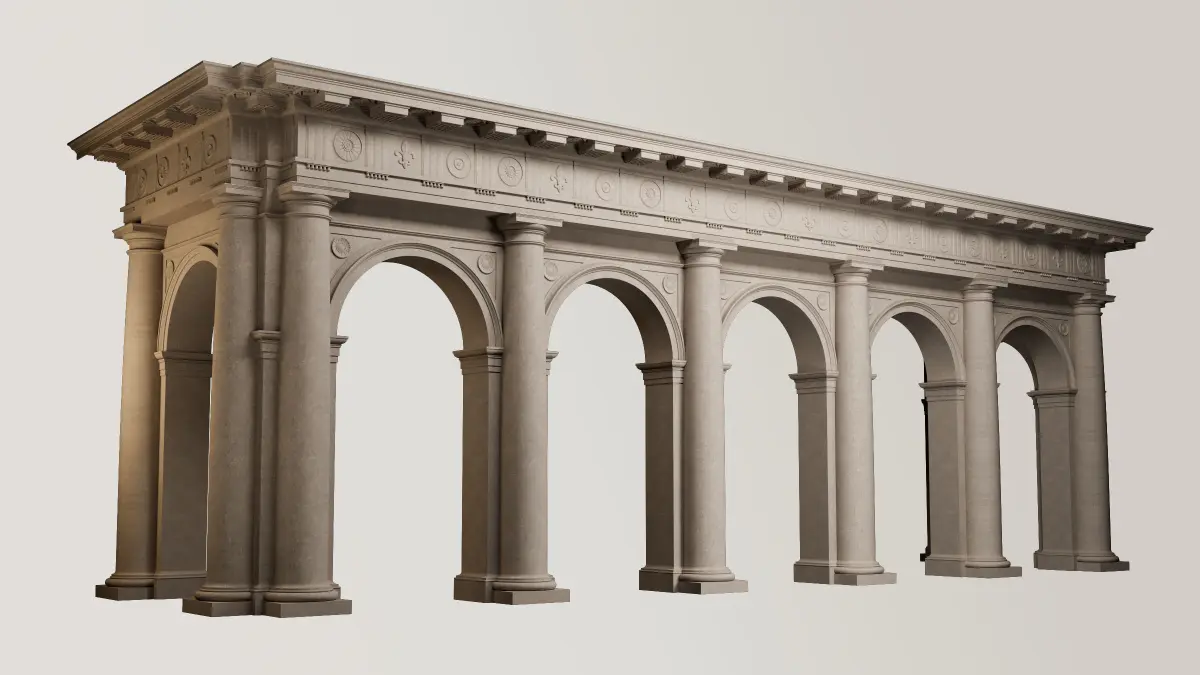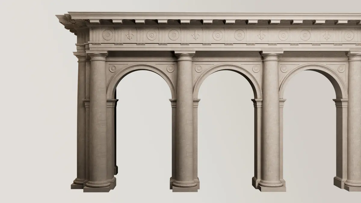 Fully detailed Arcade in Doric mutulary column with 3/4 with and entablature Doric Order on Vignola. Fluting Column