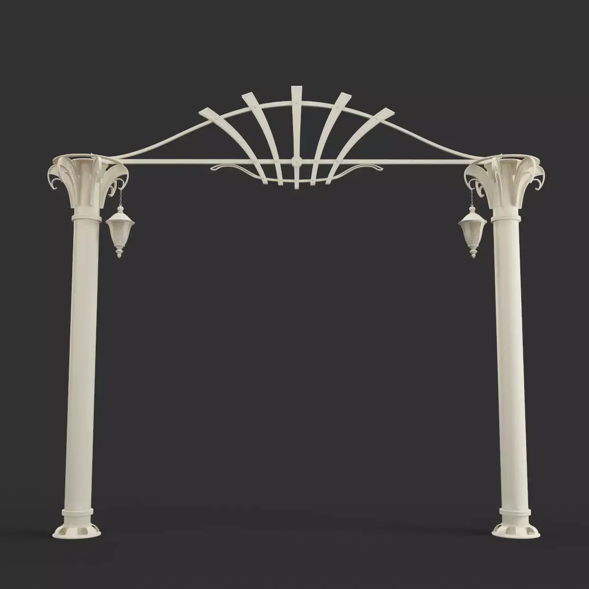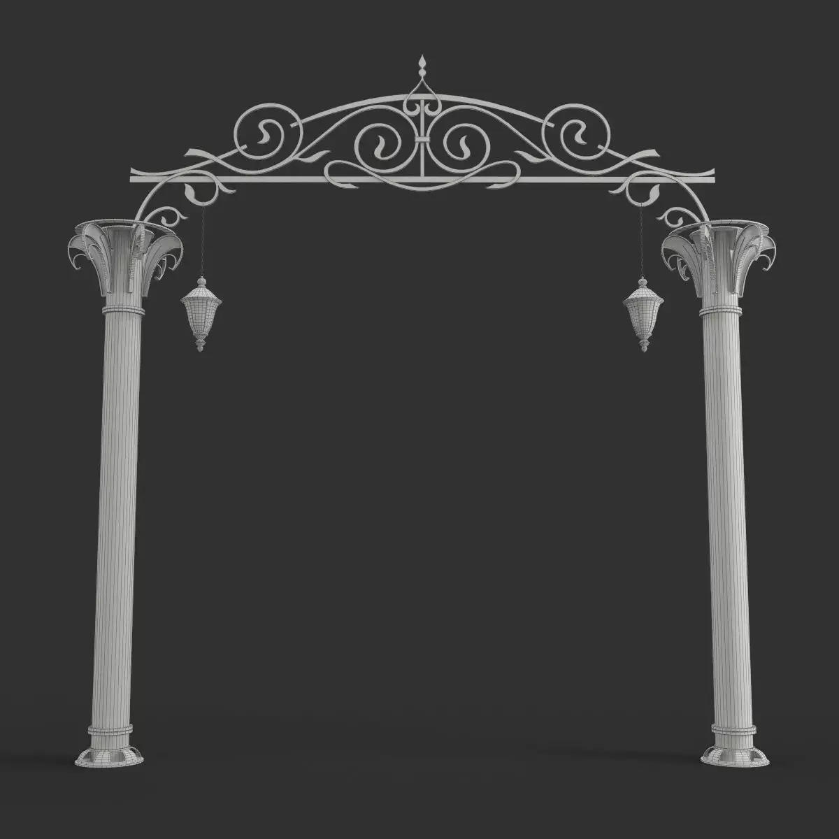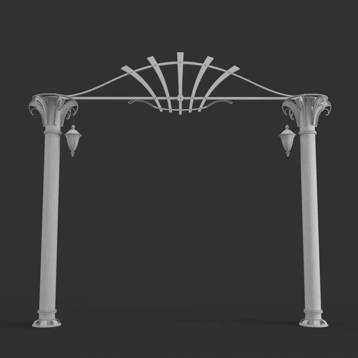 A set of 3D models of an arched entrance with columns and lamps.