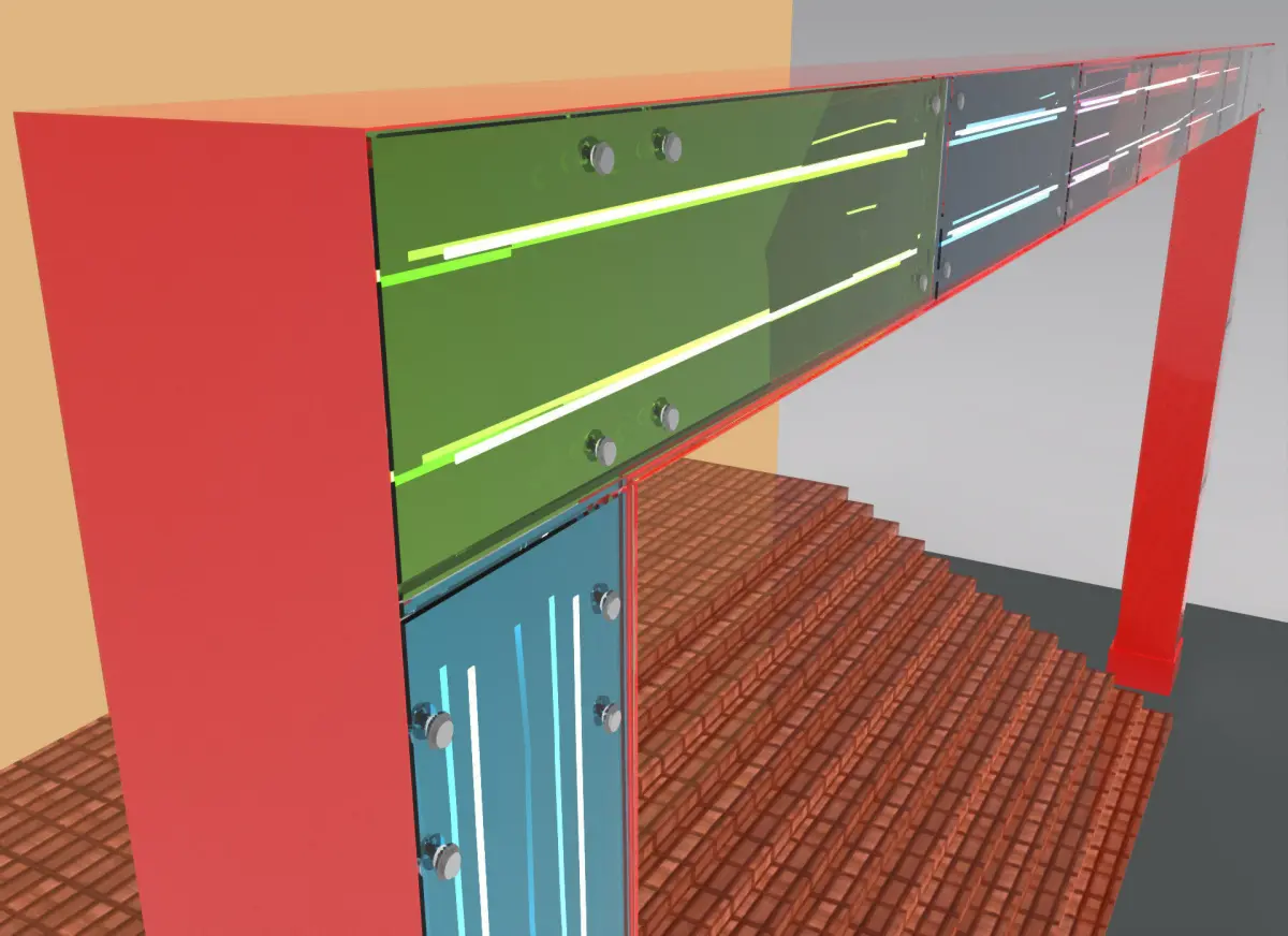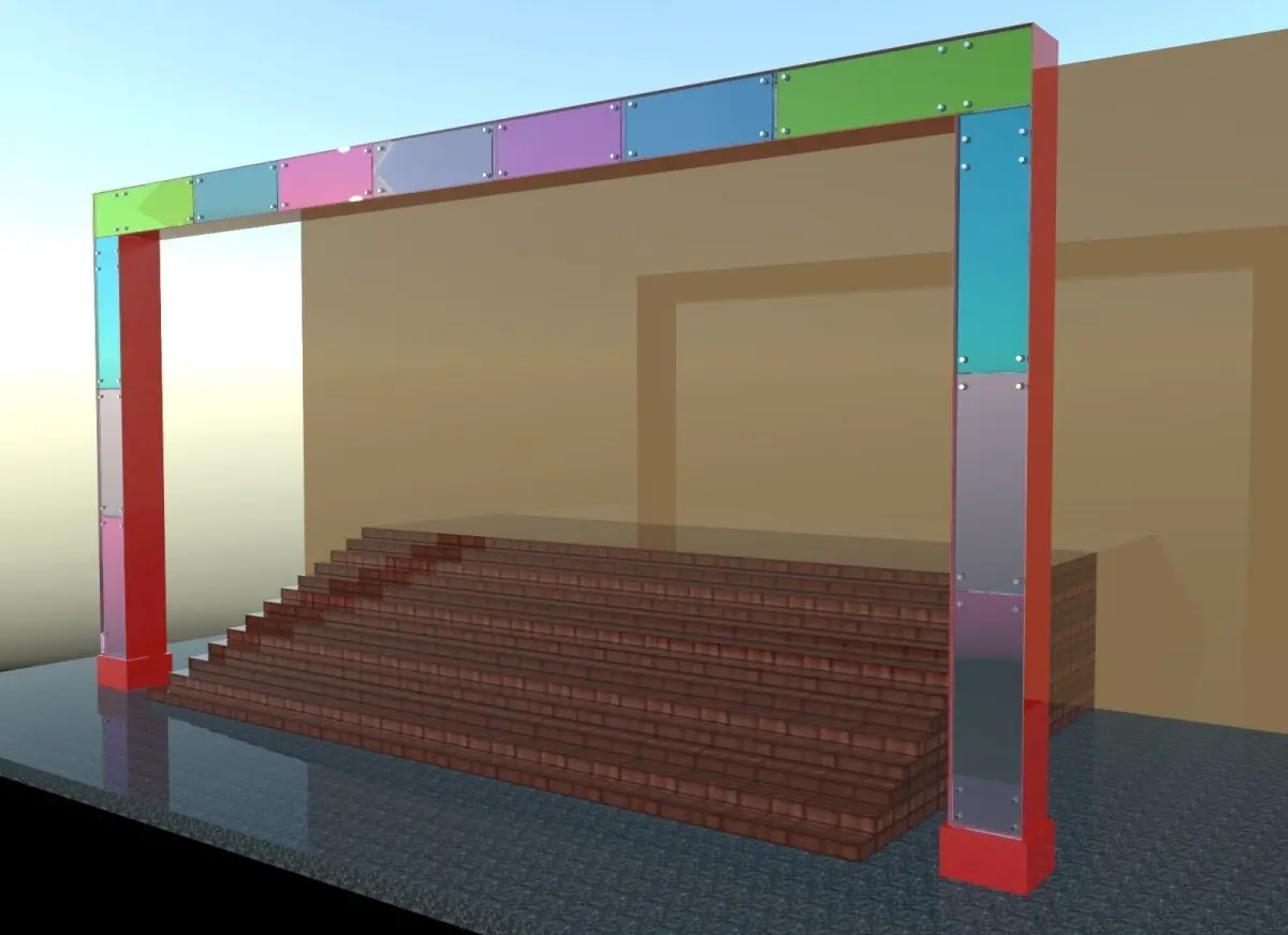 Arch of the central entrance to the shopping center with illuminated decorative glass inserts. The frame is made of low-carbon steel. The box is made of composite cassettes. Behind the glass are installed composite inserts of different colors. The backlight is made using LEDs.