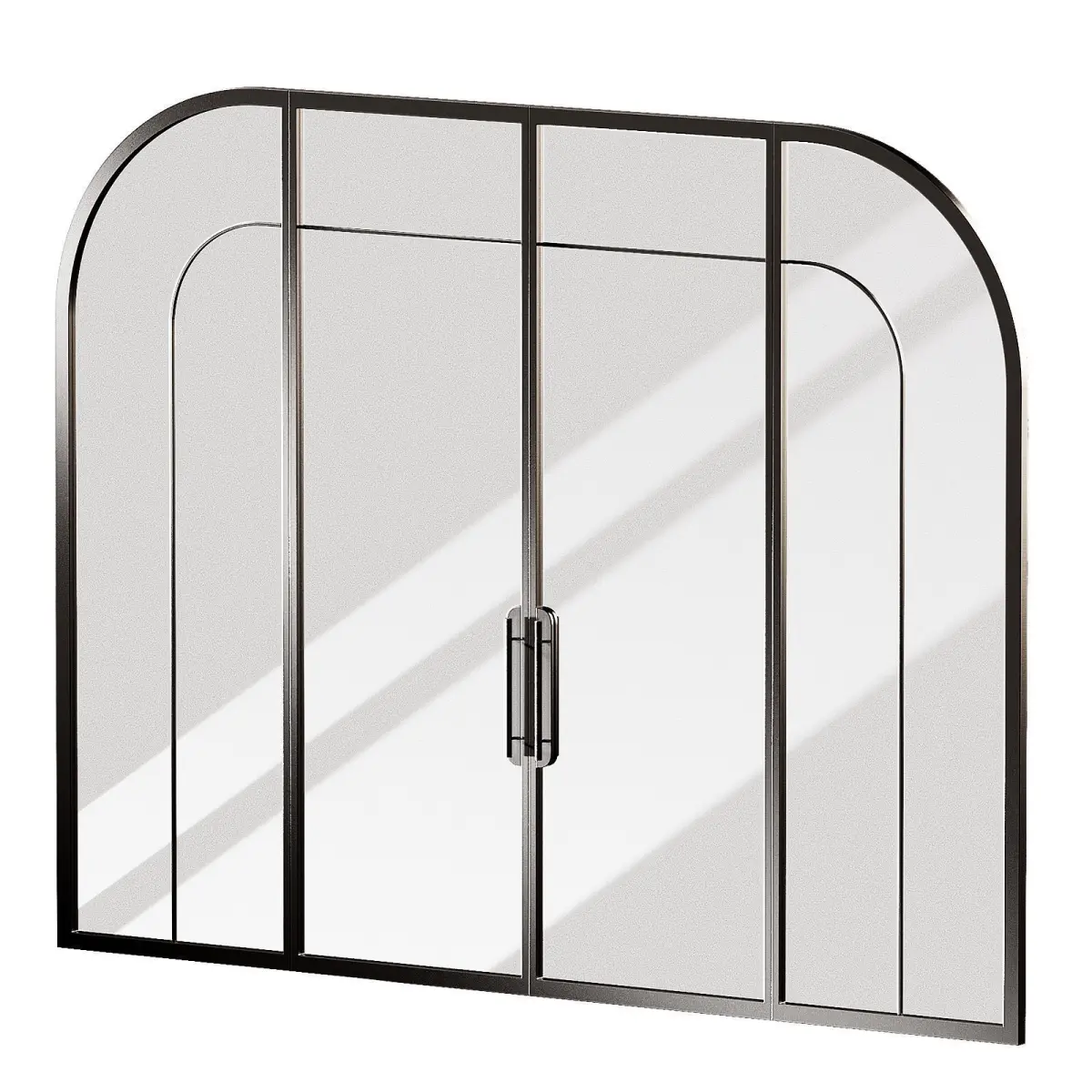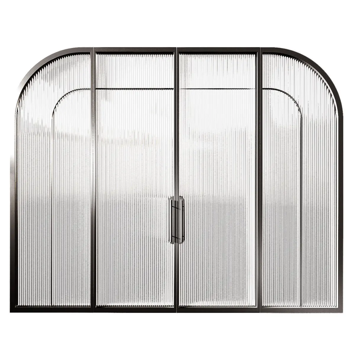 The 3D model contains arched doors made of metal and glass. 2 - glass options - corrugated ribbed translucent glass and standard tinted glass.Decorative room space divider.The zoning partition is made of metal and glass. Arched semicircular shape, hinged doors.Easy to edit to the desired size. The model is divided into separate blocks.Both options are present and ready to render