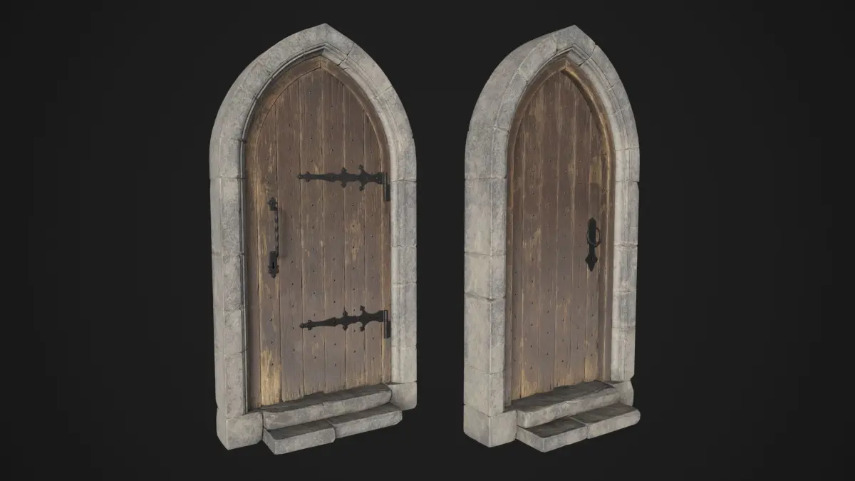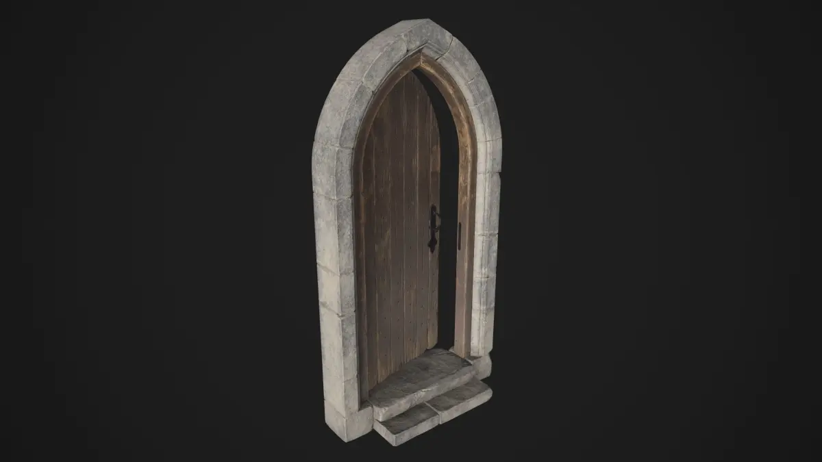 An old medieval door with a stone arch.The model is modular, you can easily remove the stone steps if necessary.