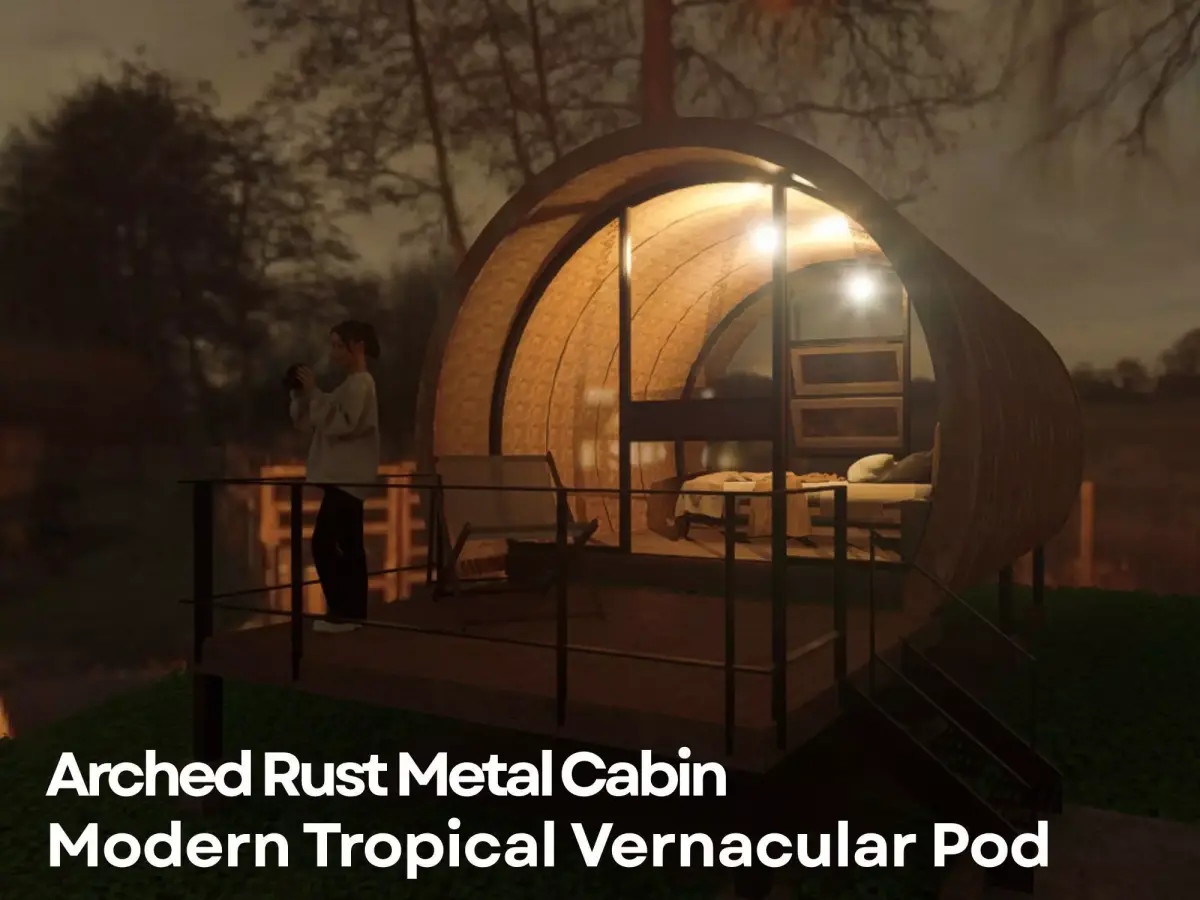 Arched Rust Metal Cabin – Modern Tropical Signature PodBring character to your project with this unique rust-metal arched cabin. The design blends industrial charm with tropical vernacular warmth—curved steel shell, bamboo interior lining, slim panoramic glazing, and an elevated deck that fits perfectly into natural landscapes.Ideal for resorts, glamping sites, concept architecture, and high-impact visualizations.Lightweight, optimized, and ready to drop into any scene.