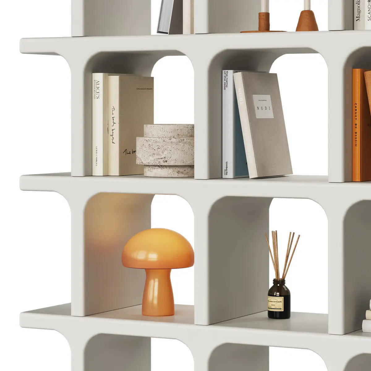 Arched shelving unit with accent orange decor.