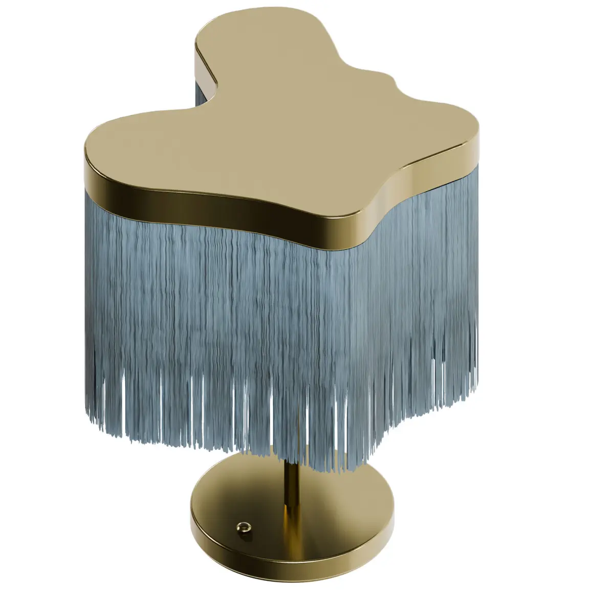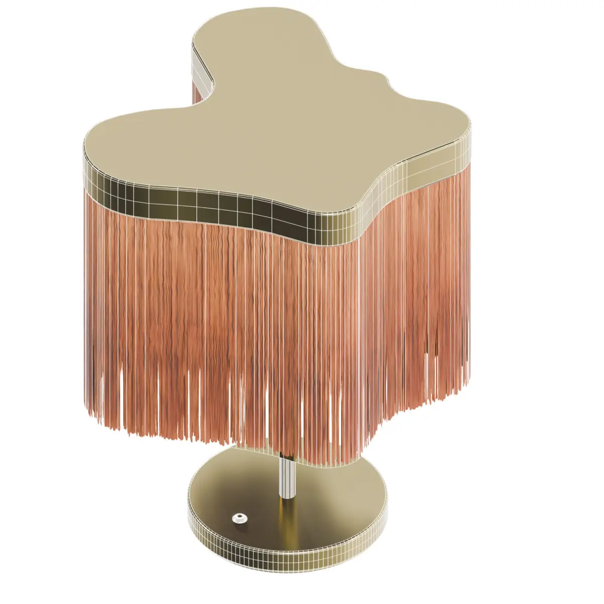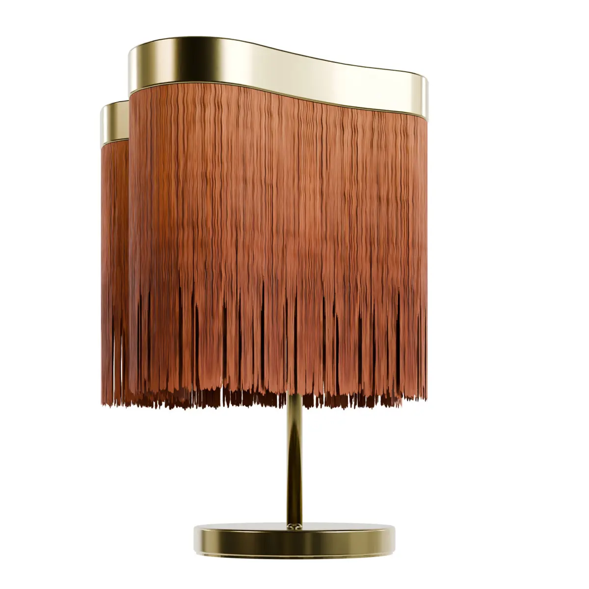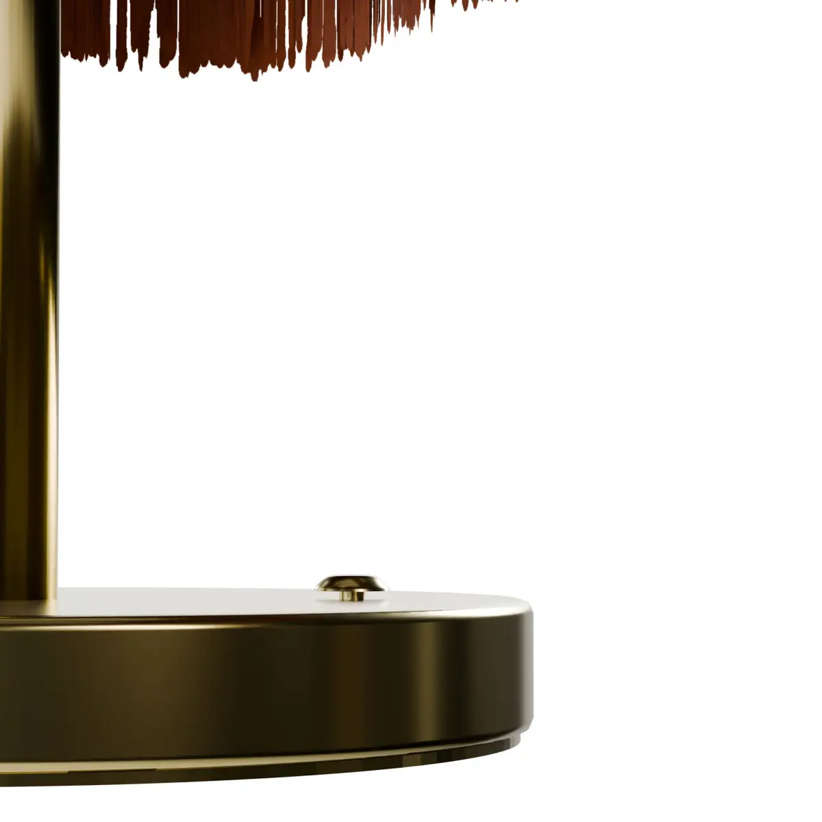 Outstandingly glamorous in its fringed design, this table lamp makes for a clever solution for accenting contemporary settings with a dash of fancy allure. Rust-toned fringes - descending from a sinuous top element whose irregular contours are playfully inspired by archipelagos - filter the light in a suffused glow that also contributes to enhancing the structure's delicate satin brass finish.