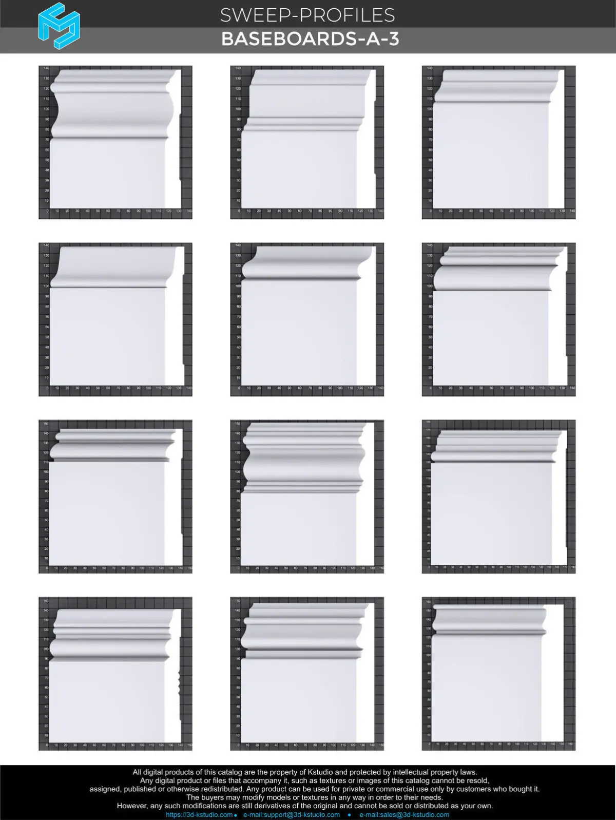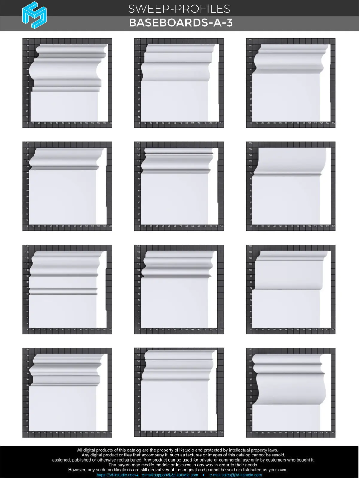 Set from 44 baseboard molding shapes for use in 3ds Max.A baseboard is a well-known finishing element to a flooring project.The baseboard molding serves as a transition from a horizontal surface (e.g. your new laminate floor) to the vertical surface of a wall.Baseboard molding can add an effect to the appearance of your room.Ready for use with the plugin “Sweep Profile”.
