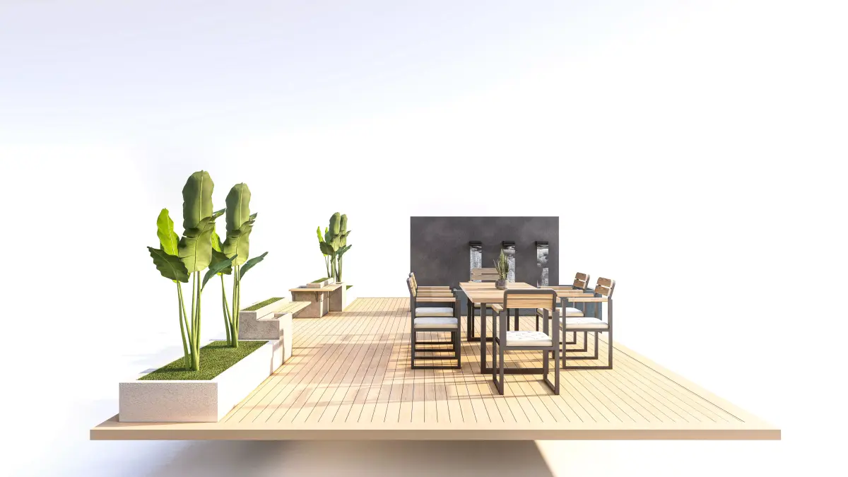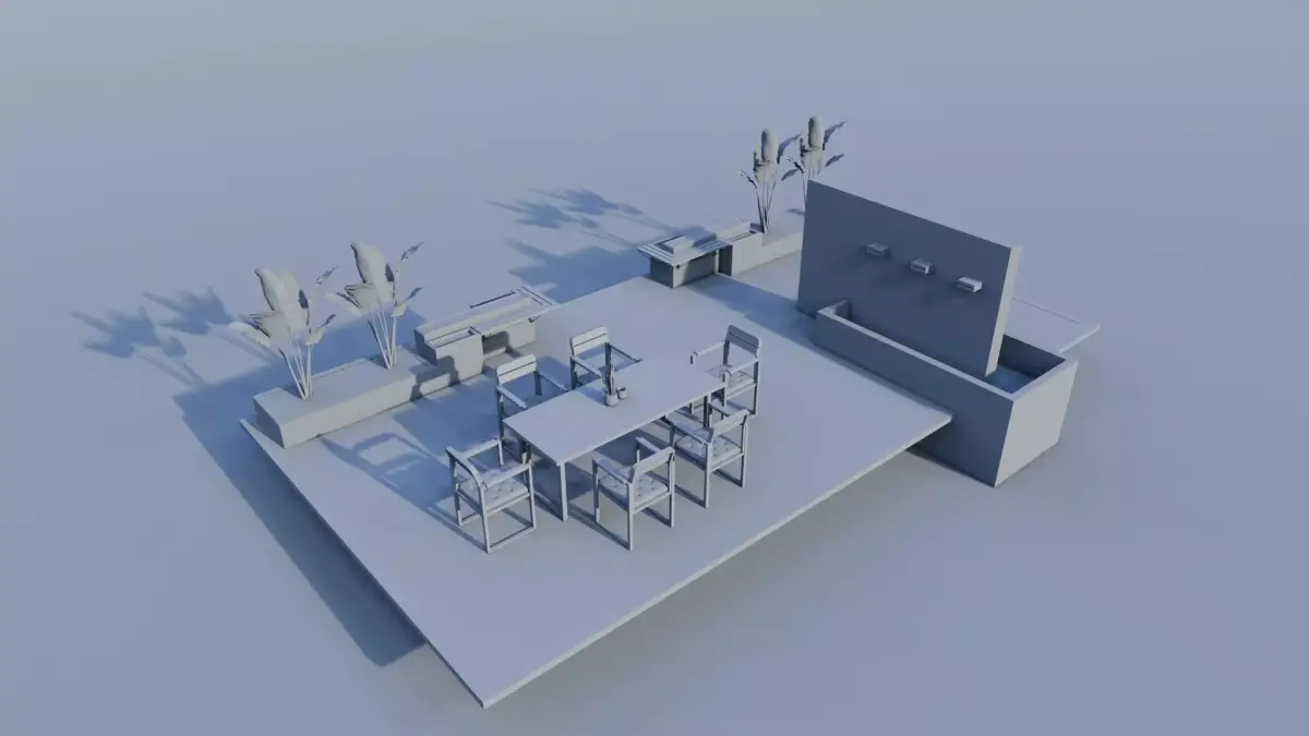 Dining Set:Includes a stylish outdoor dining table and chairs, ready for scene population.