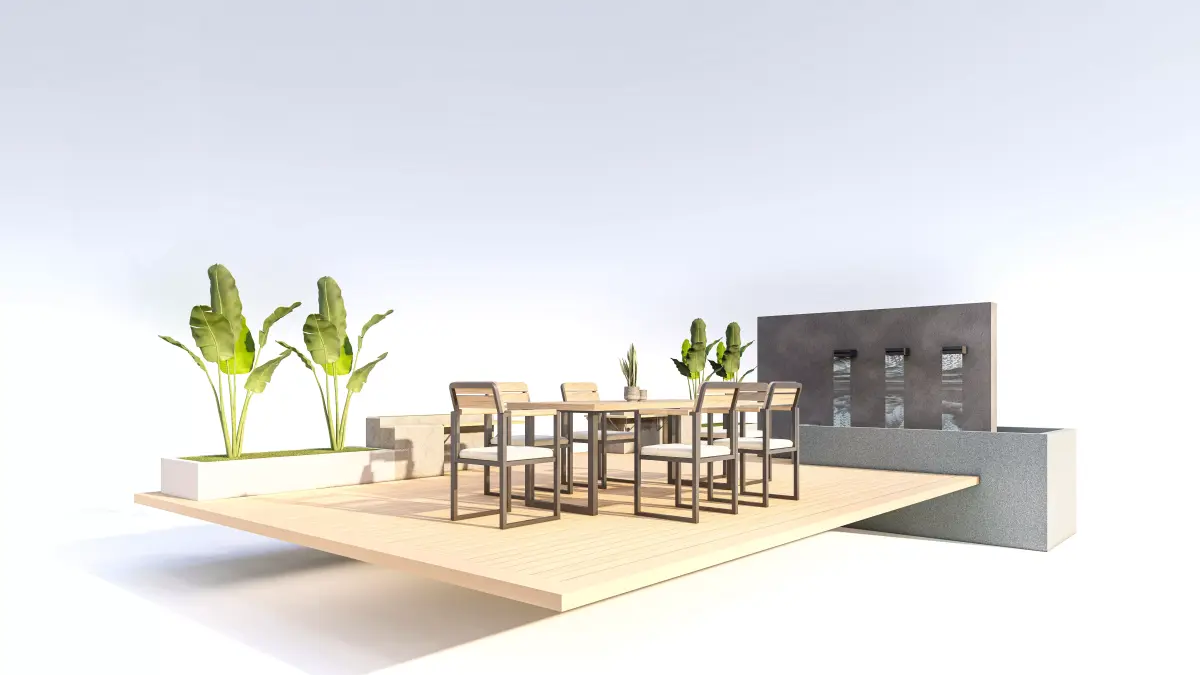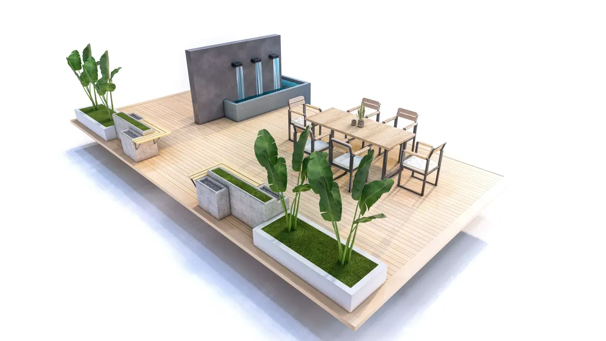 This highly detailed 3D model presents a contemporary, elevated outdoor living area featuring a clean, minimalist design ideal for high-end architectural visualization and landscape projects.