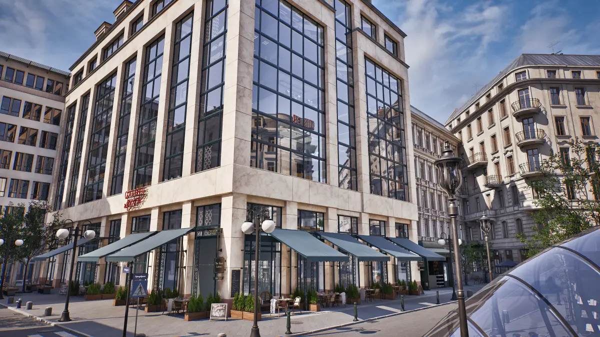 We made sure that there is no emptiness behind the glass - we placed 33 variants of parallax OSL maps in shop exposistions and glazed offices. So you can see fully equipped interiors behind glass windows. The parallax effect gives the impression of depth. All assets are carefully textured. We created 900 shaders, used 2044 textures, of which 156 are tiled. Most of the objects are converted to Nanite and the scene uses Virtual Textures, it makes the scene run smoothly. We recommend RTX 2080 Ti GPU or better.