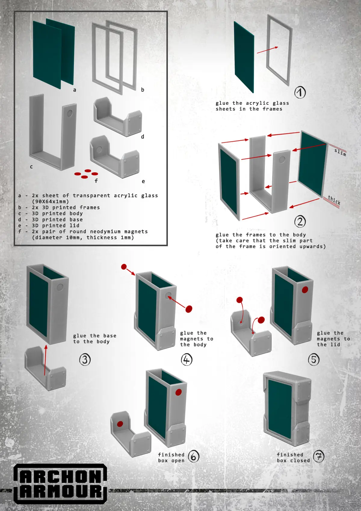 Additionally to printing out the parts you will need two sheets of acrylic glass (90x64x1mm), two pairs of neodymium magnets (round, diameter 10mm, thickness 1mm) and quite a bit of glue to connect the components.Be patient and take your time during assembly, this is a handcrafted product. Be especially careful when applying the magnets - don´t confuse the attracting sides.