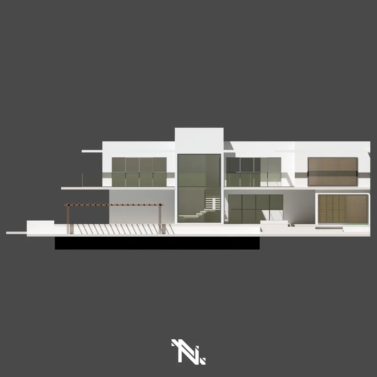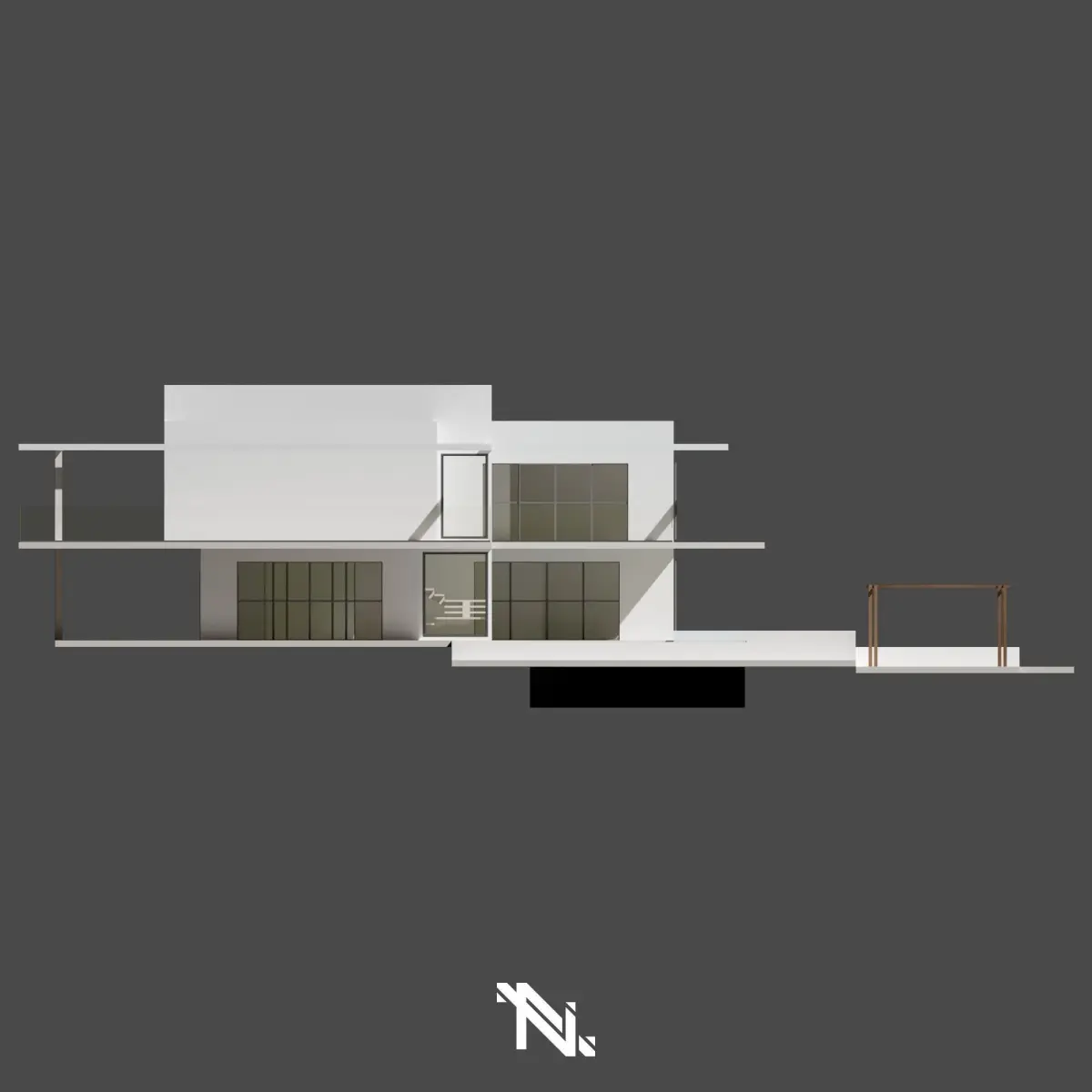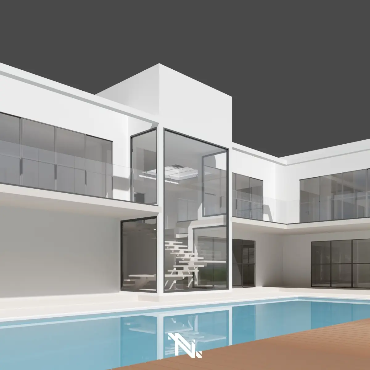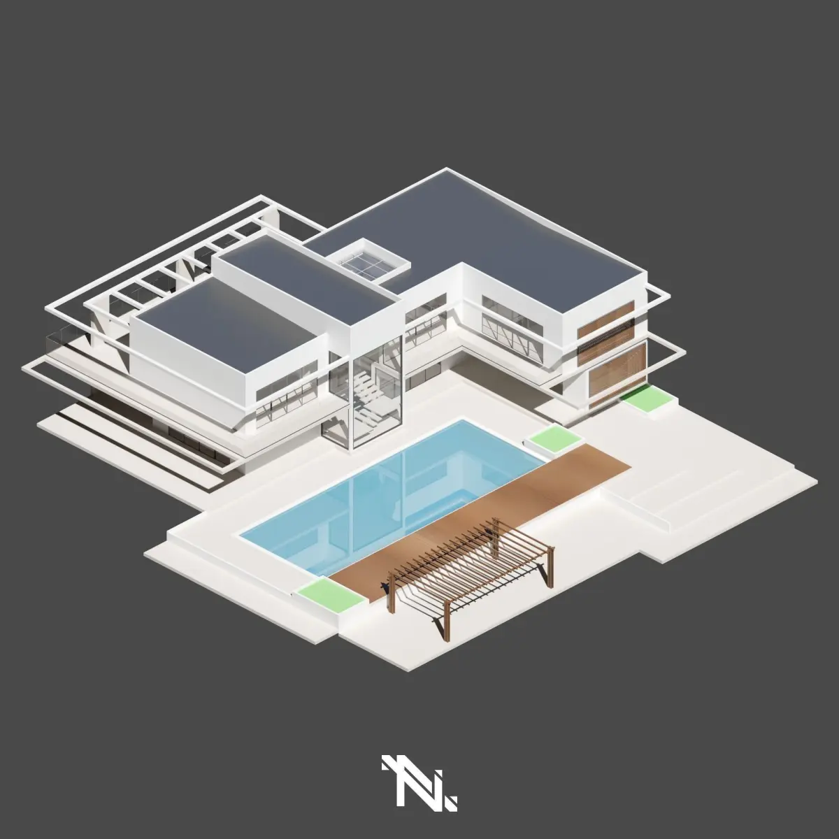 House modeling with modernist architecture, firm lines and solid colors. The white contrasts with the vegetation, giving the building an air of grandeur. Internal modeling included, all environments (bedrooms, living room, kitchen, ...) are present.