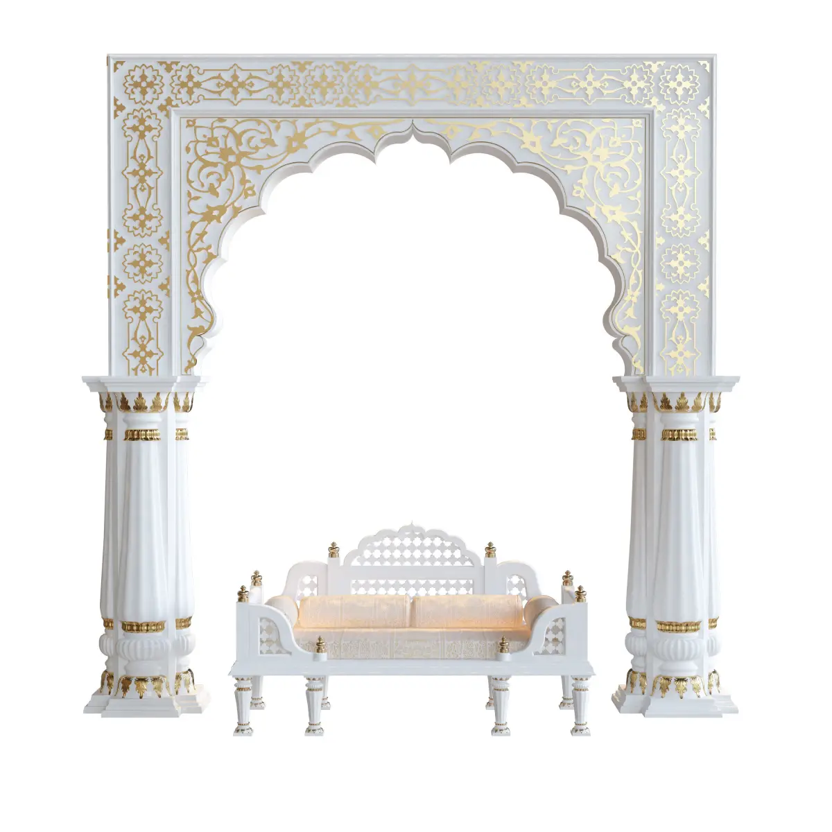 high detailed Indian style archway and marble bench 3d model is assembled as carefully as possible, Formats in the archive: MAX2020and 2015 FBX, Model created in 3ds Max 2023, Native Max file setup with V-Ray render And V-Ray materials.