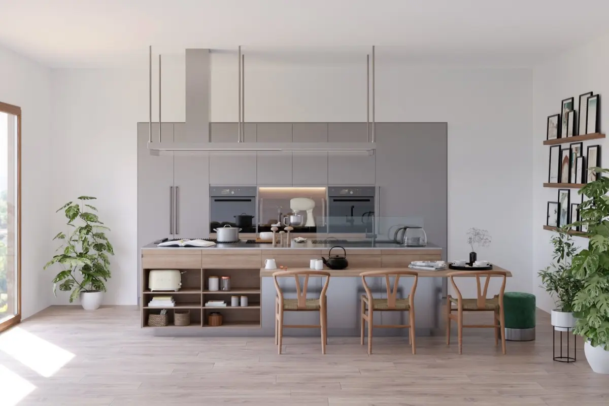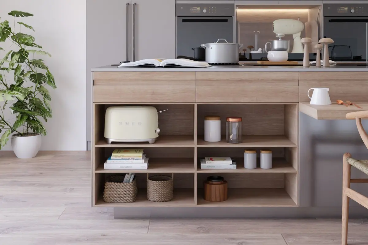 DESCRIPTION: Compact and minimal, the island integrates preparation and cooking, with room for socialising and features a very slim worktop with recess and Convivium Elegant door in Vintage stainless steel. The finish is the result of a manual process that gives the steel a ’warmer’ look, perfect with the elegant soft fossil oak wood of the snack bar table, the open unit, and built-in drawers. The same drawers are used in the functional wall of tall units behind the island. With Fenix NTM hazelnut Convivium Elegant door, this houses, in the middle, the Mac, the handy multifunction unit designed to provide useful extra work space.