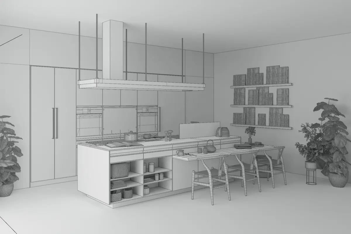 DIMENSIONS: Linear kitchen: 4000 mm (L) x 600 mm (D) x 2300 mm (H) - benchtop height: 900 mm - Island: 300 mm (L) x 1100 mm (D) x 900 mm (H)