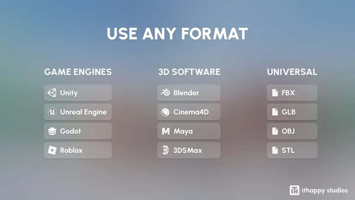 FILESYou’ll be able to download formats such as Unity Package, UE, Blender, C4D, Maya, 3DSMax, FBX, OBJ, GLTF, and STL.