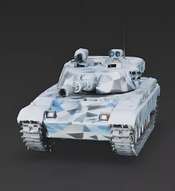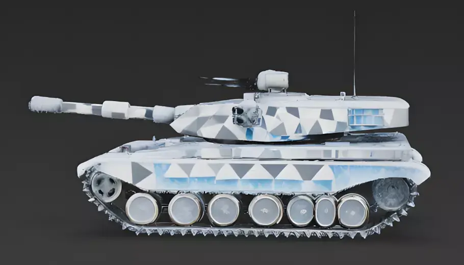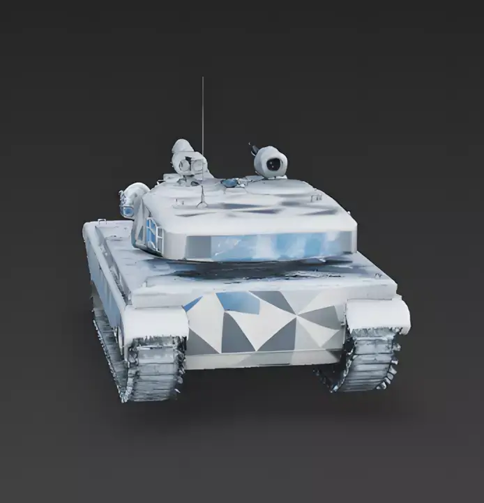 Geometric Winter Camouflage The tank is covered in a unique digital camouflage pattern. It uses sharp triangles of white, grey, and ice-blue to break up the shape of the vehicle, making it hard to spot against snow and icebergs.