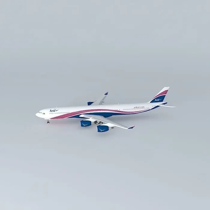 This 3D model was originally created with Sketchup 8 and then converted to all other 3D formats. Native format is .skp 3dsmax scene is 3ds Max 2016 version, rendered with Vray 3.00 I have some kind of request - please do the Airbus A340-500 Template, someone. This is just almost un-workable! Also, please note that some details were on purpose left out - for example the credit to R.C.P. Line Alliance for the liner, the Arik Air on the winglets - very hard to make and adds polygons, the name of the plane though the registration is there because I can't find the proper font, the words The wings of Nigeria under Arik Air on fuselage since I can't find the font and color, %26 the www thing infront of the arikair.com since I can't find a proper image. Use the link for info. I nearly died from boredom of smoothing out this hard transition between the cockpit and the fuselage. When intersecting holes appear. Some very annoying glitches, that I ask to be removed by simply creating a template from scratch rather than combining the cockpit from to an un-workable fuselage. Huh. Please do from scratch. Gracias.