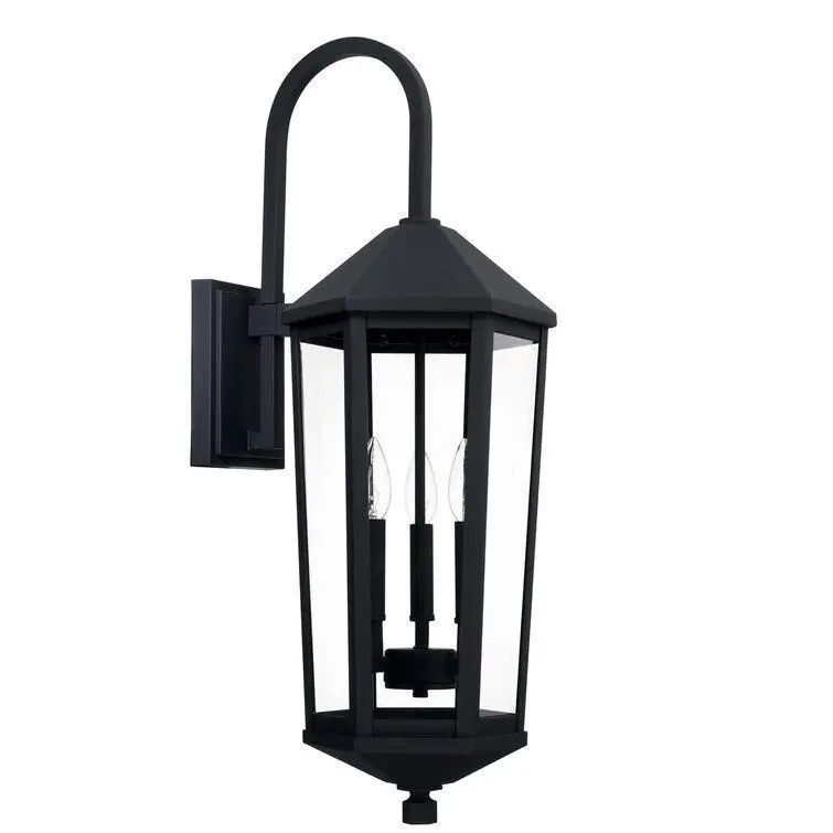 - This 3-Light Outdoor Wall Lantern features sharp, clean and minimal lines, slanted domes and clear glass panels. This collection brings character and illumination to outdoor settings such as porches, patios, and decks. Crafted using the non-corrosive material.