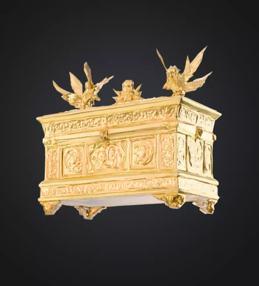 Cherubim Figures: Two finely crafted cherubim on the lid, with wings spread in a protective stance.