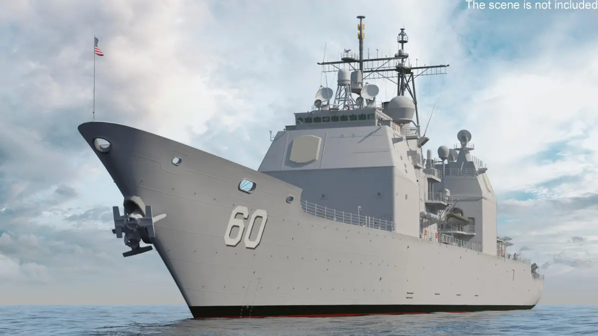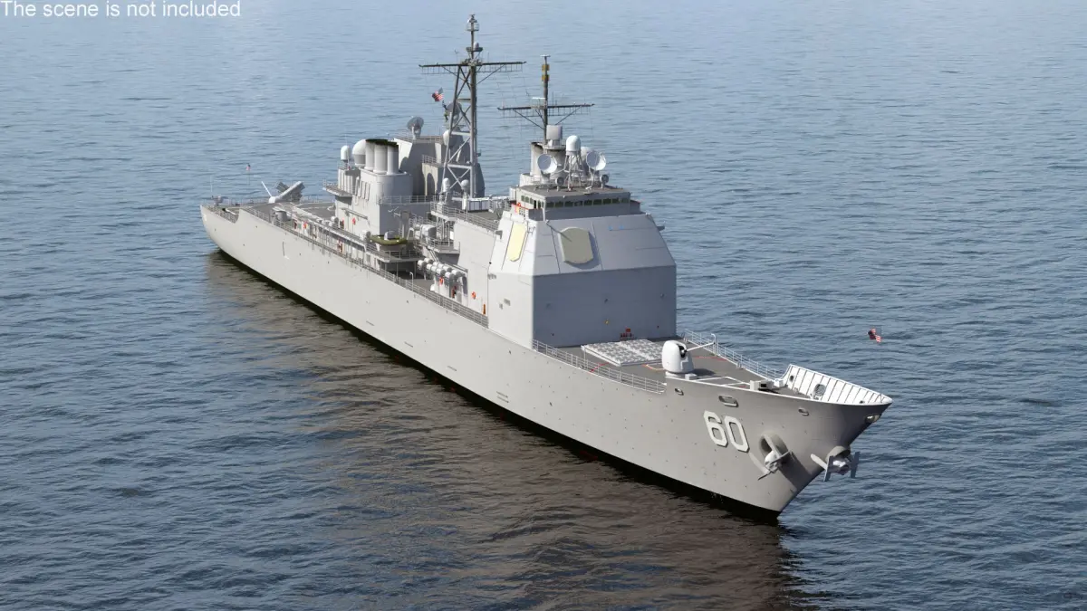 Arleigh Burke Class Destroyer USS CG-57 is a 3d model of a guided missile destroyer, part of the United States Navy’s Arleigh Burke class, known for its advanced technology, firepower, and military capabilities.