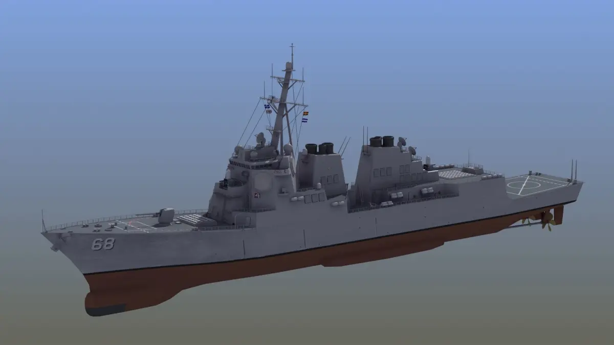 Arleigh Burke Destroyer of the US Navy (Flight2A). Great multipurpose 3D model (ideal for offline rendering or real time uses such as games or simulation). Atlased textures with good UV layout.