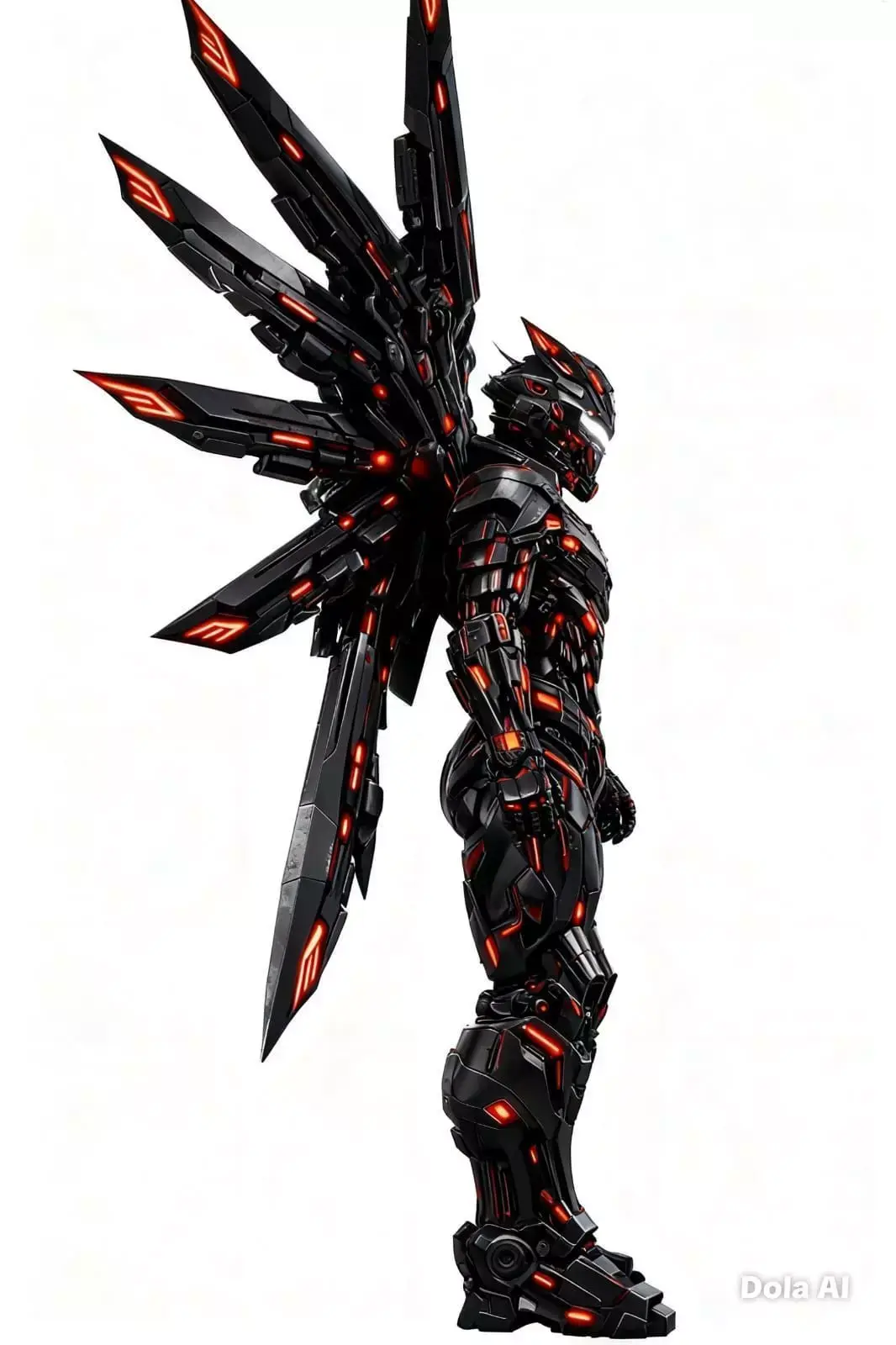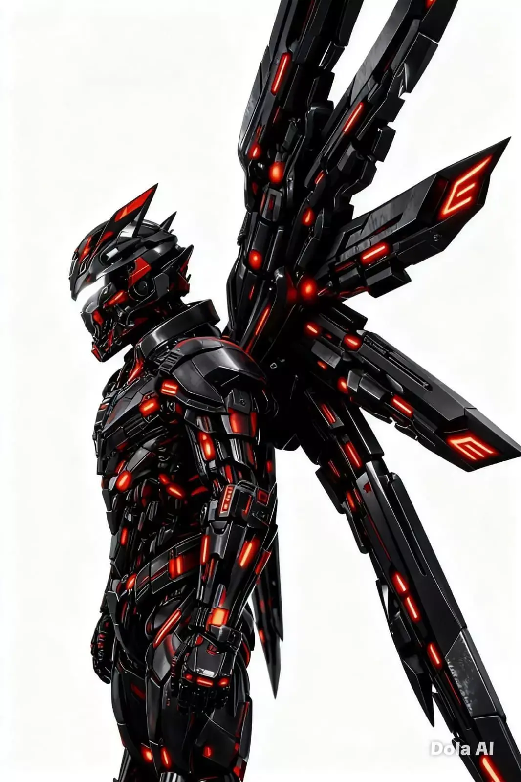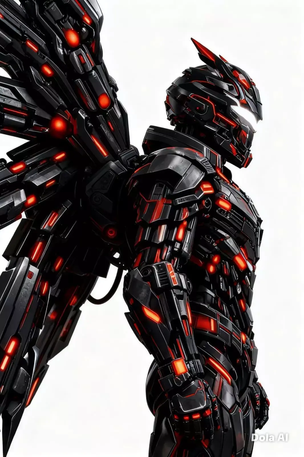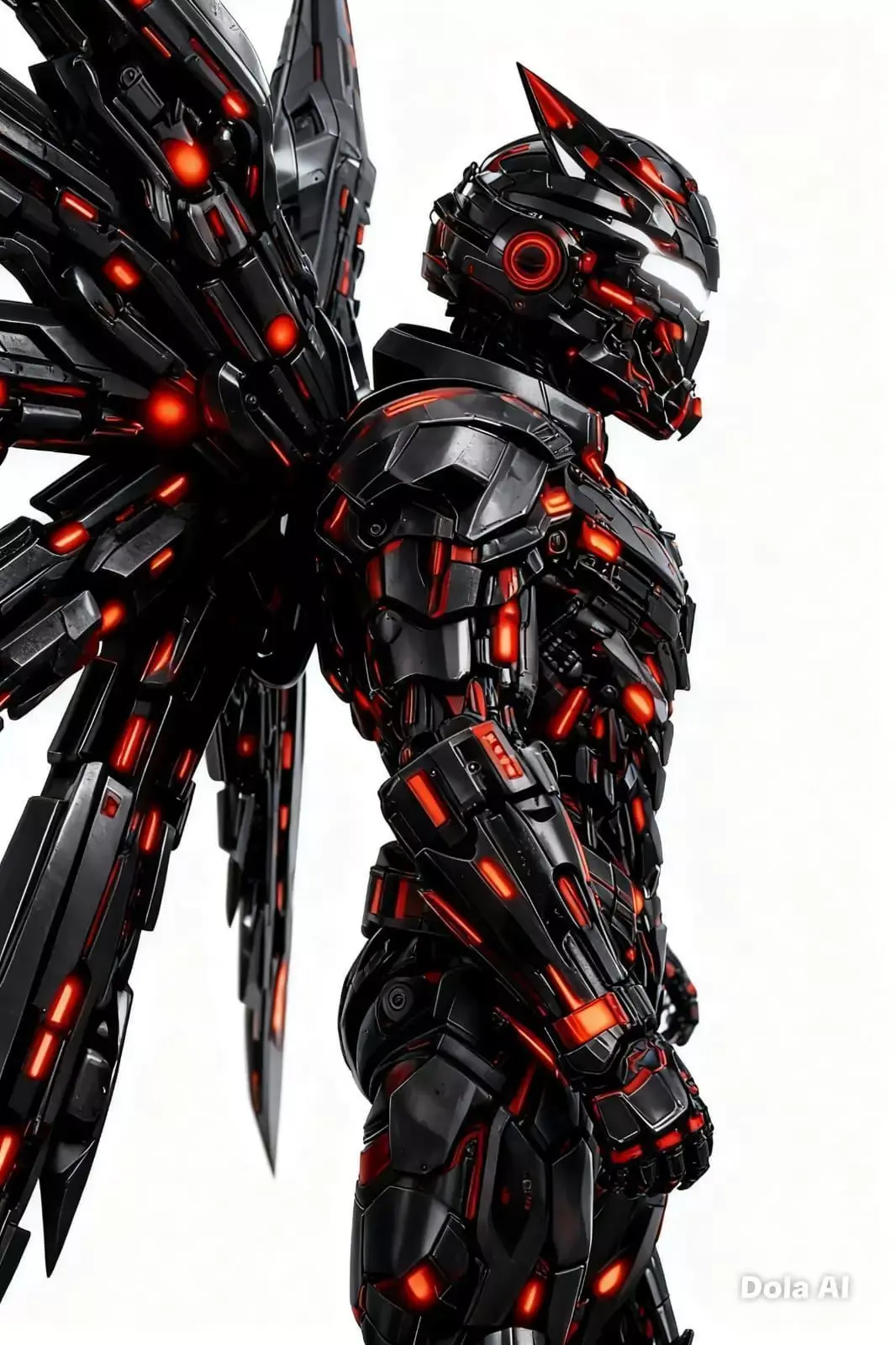 La armadura presenta alas cuádruples de gran tamaño, cuidadosamente integradas al diseño para aportar una presencia majestuosa y una silueta distintiva. La paleta de colores en negro, rojo y blanco luminoso refuerza el contraste visual y transmite poder, pureza y determinación. Las superficies muestran un trabajo detallado en volúmenes y formas, manteniendo una apariencia limpia y profesional.