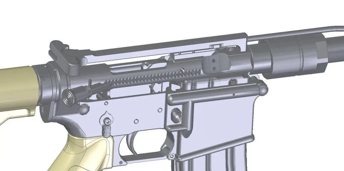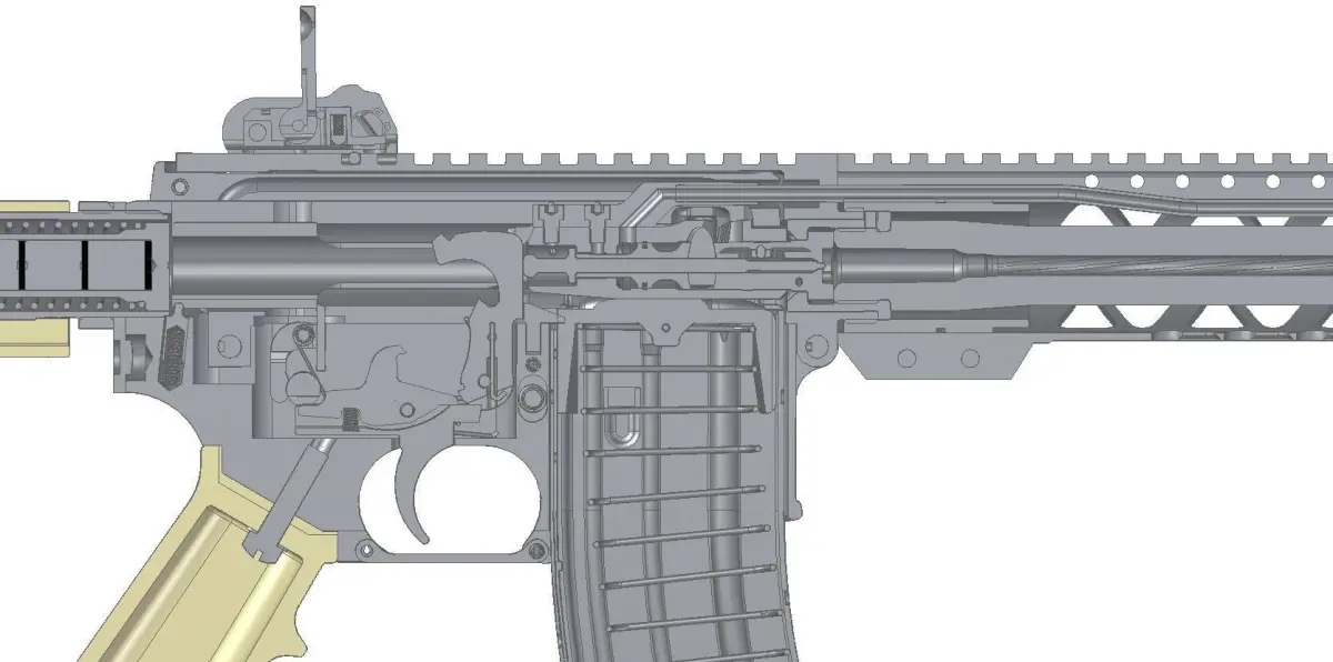 The lower receiver is the serial-numbered part legally defined as the firearm under United States law. However, this definition is currently questionable due to a 2019 court ruling that the AR-15 lower receiver does not match the legal definition in 27 CFR § 479.11. A completed lower receiver is visually distinguished by the trigger guard ahead of the detachable pistol grip, and behind the magazine well capable of holding detachable magazines. The lower receiver holds the trigger assembly including the hammer, and is the attachment point for the buttstock. The lower receiver is attached to the upper receiver by two removable pins. Disassembly for cleaning or repair of malfunctions requires disengaging these pins from the upper receiver. Removal of the rear take-down pin allows the receiver to be opened by rotation around the forward pivot pin as a hinge.The upper receiver contains the bolt carrier assembly and is attached to the barrel assembly. Sights will be attached to the upper receiver or the barrel assembly. A handguard usually encloses the barrel and a gas-operated reloading device using burnt powder gas vented from a hole (or port) in the barrel near the forward end of the handguard. The handguard is attached to the upper receiver and may also be attached to the barrel.