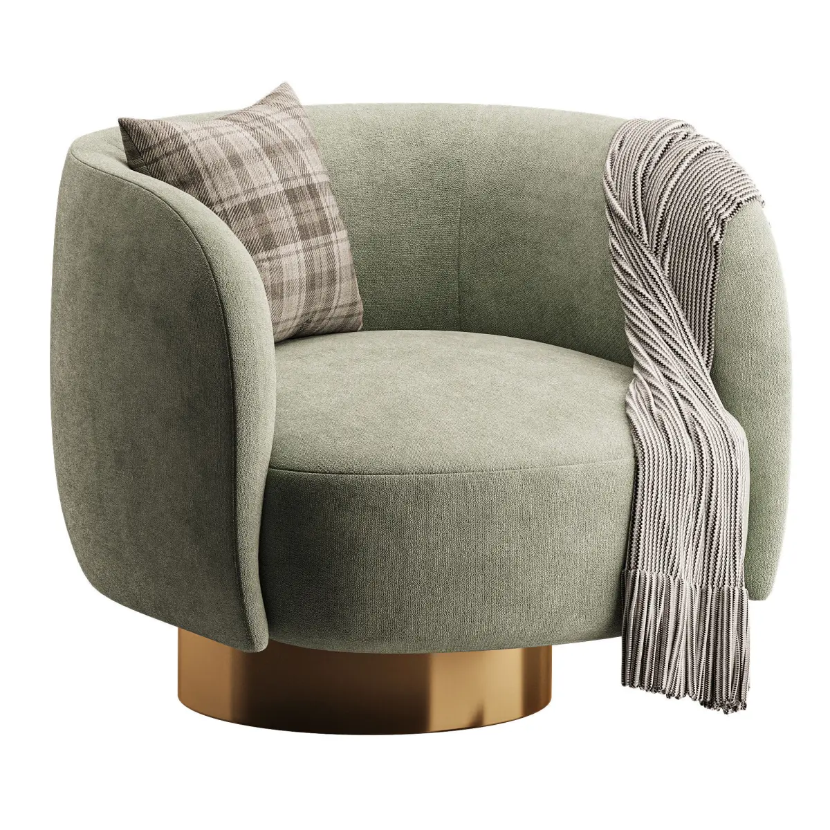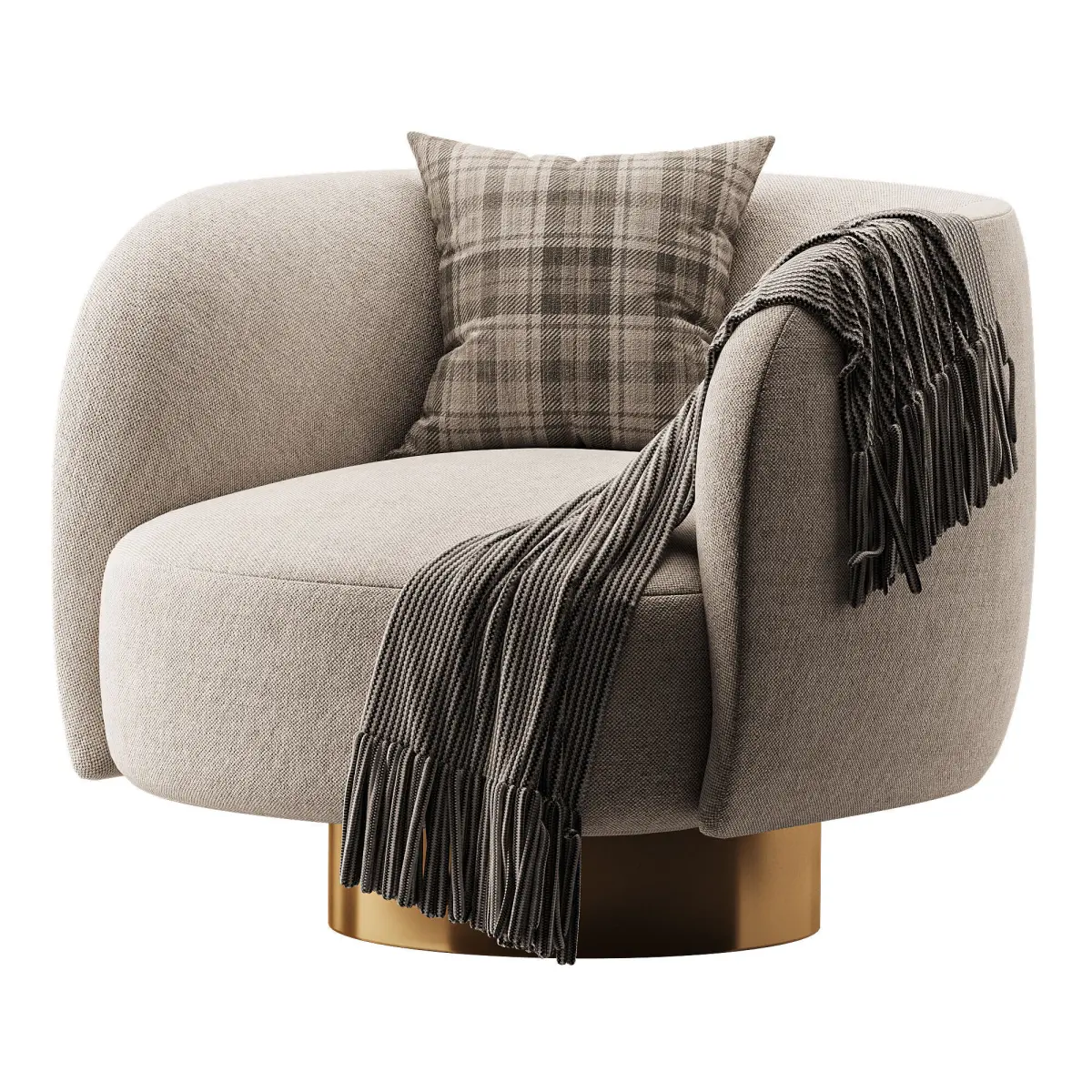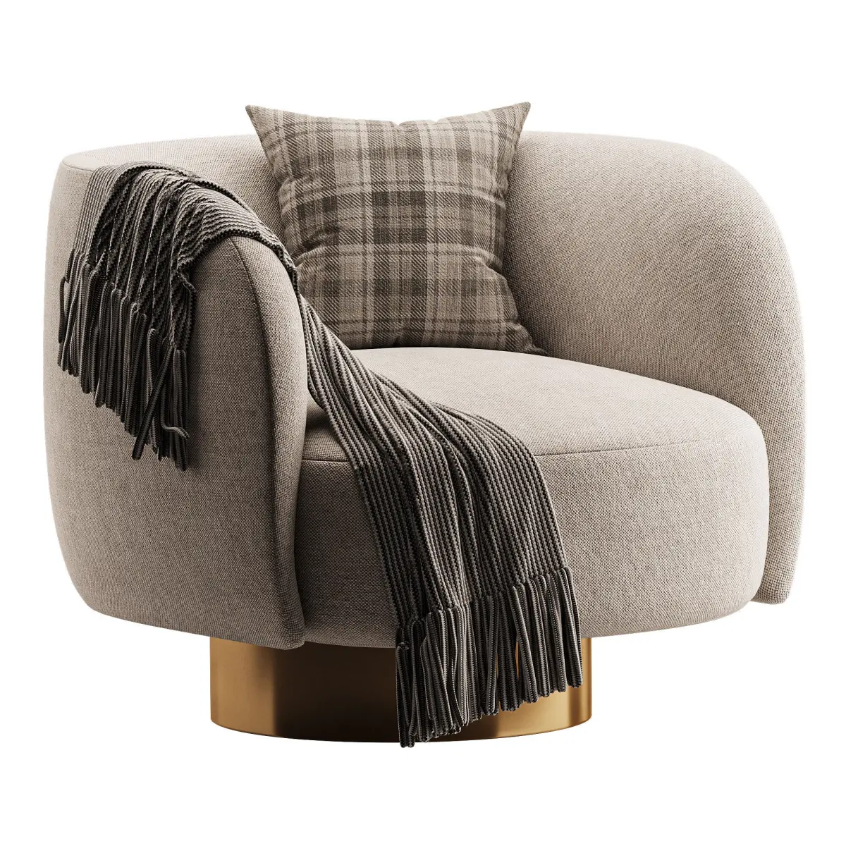 The DORIS Armchair by Bontempi Casa blends classic elegance with modern design through its enveloping curved form and plush upholstery. With a fully upholstered body available in fabric or leather, this armchair offers superior comfort. A refined metallic base in a warm golden tone adds a sophisticated accent, contrasting elegantly with the soft, cushioned seat and back. A plaid pillow and draped knitted throw blanket enhance the cozy aesthetic, making this piece perfect for upscale lounges, reading corners, or stylish living rooms.