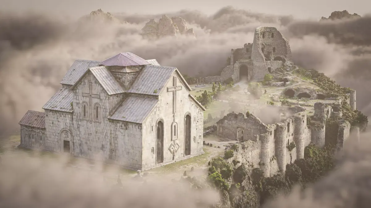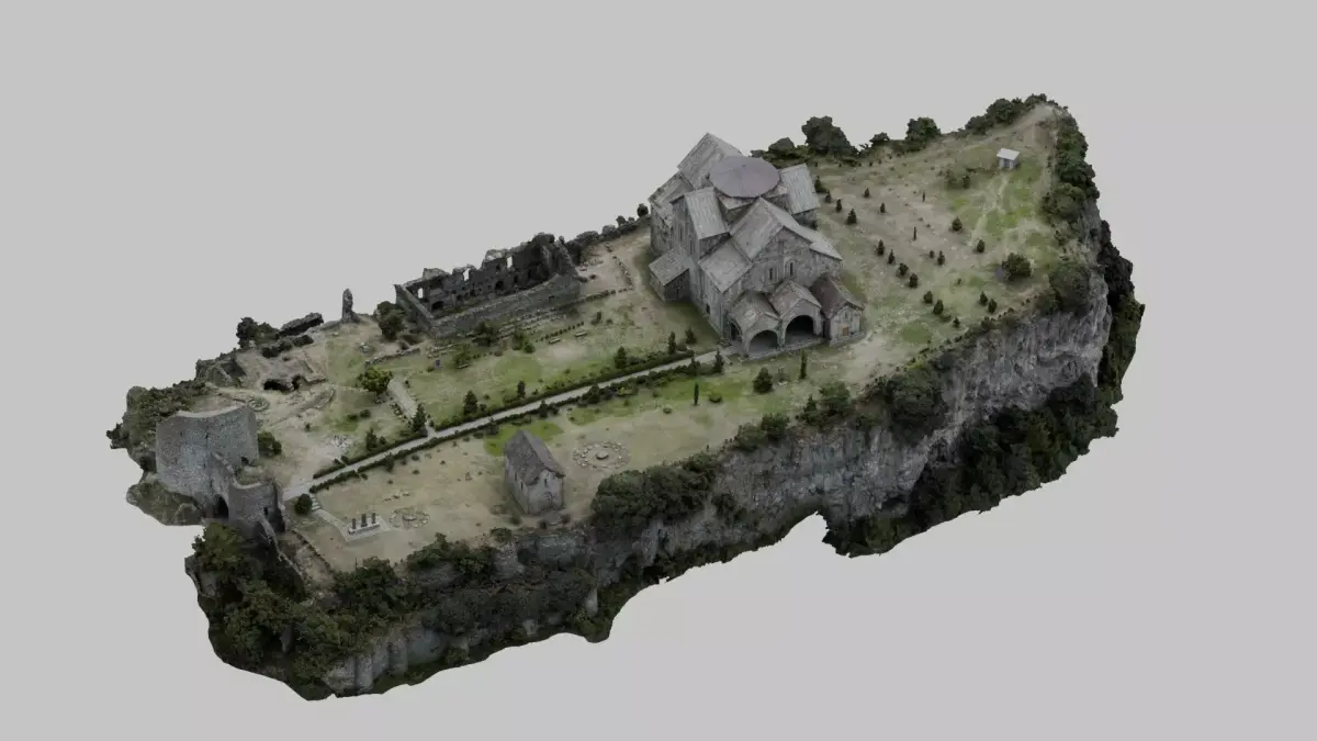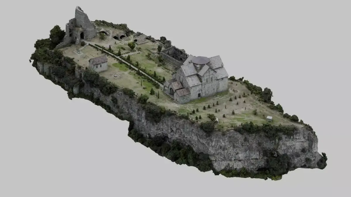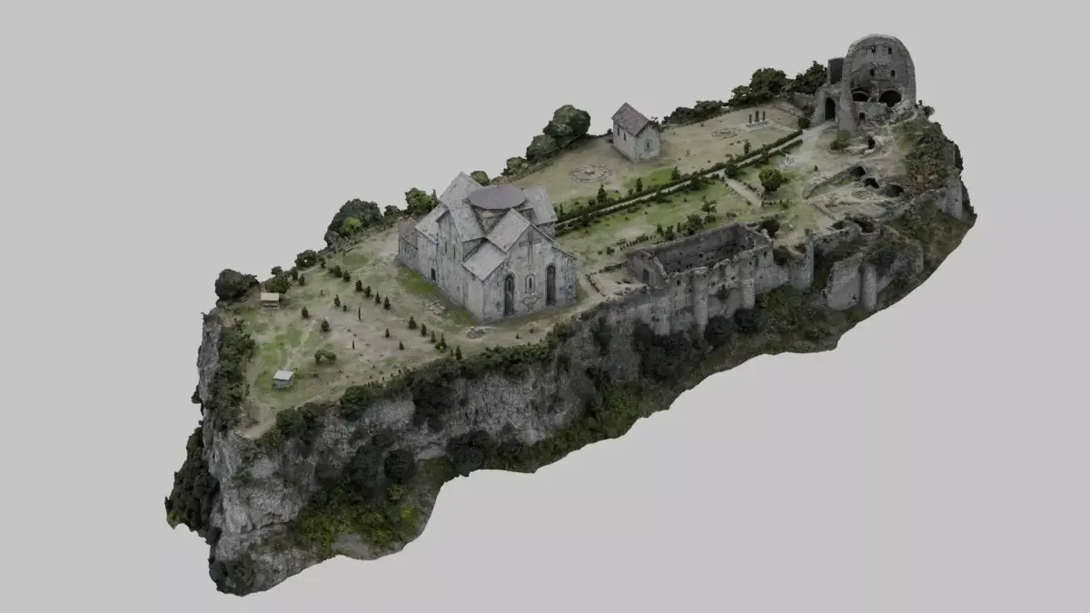 Drone-captured photogrammetry scan of a fortified Armenian monastery complex perched on a rocky cliff. Features medieval stone church, defensive walls, and ruined tower. 600+ photo reconstruction with 16K albedo, 8K normal and occlusion maps.