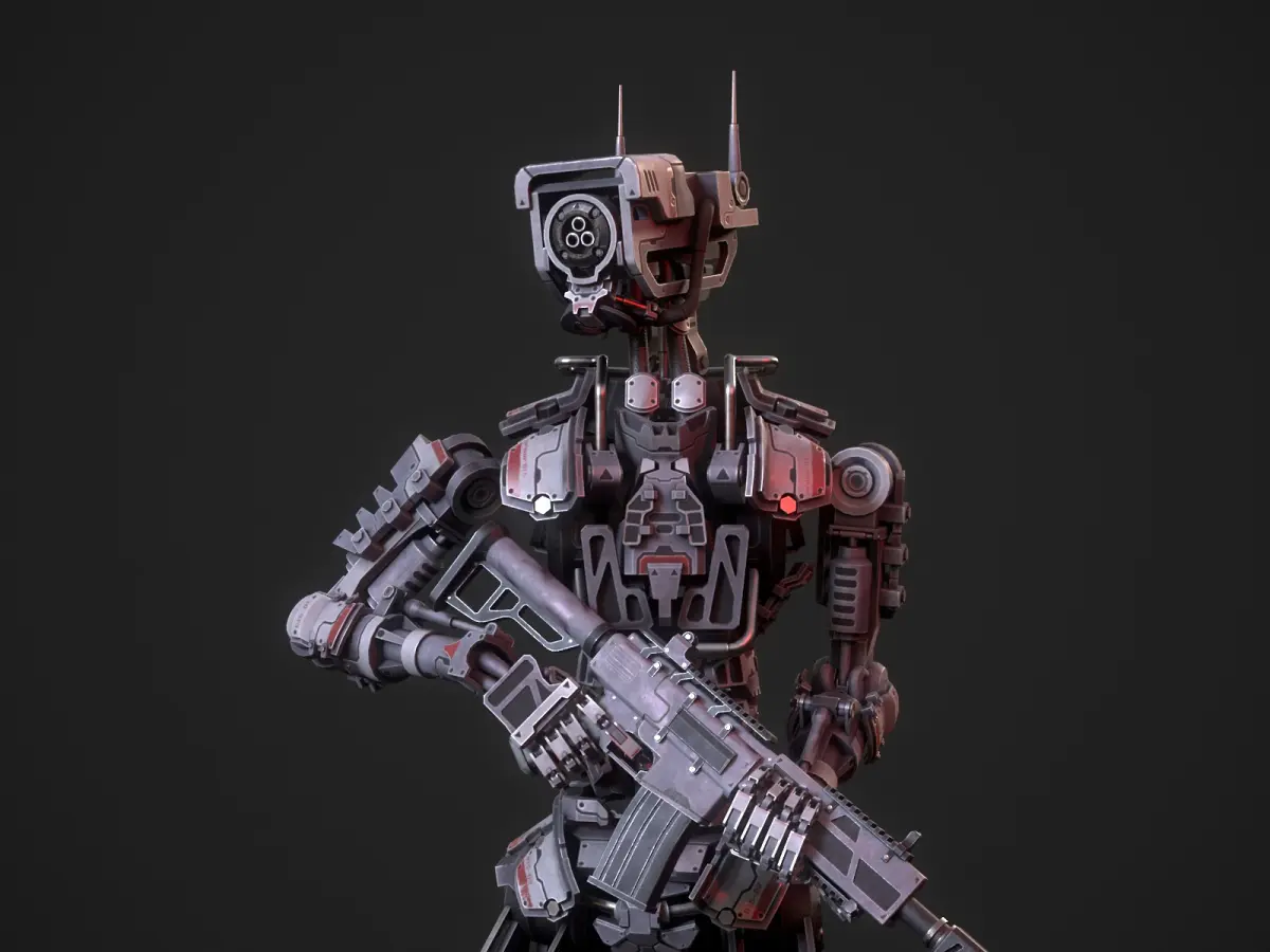 Game-ready model of a heavy-armored futuristic robotic soldier. Suitable for use in games, movies, and renders.