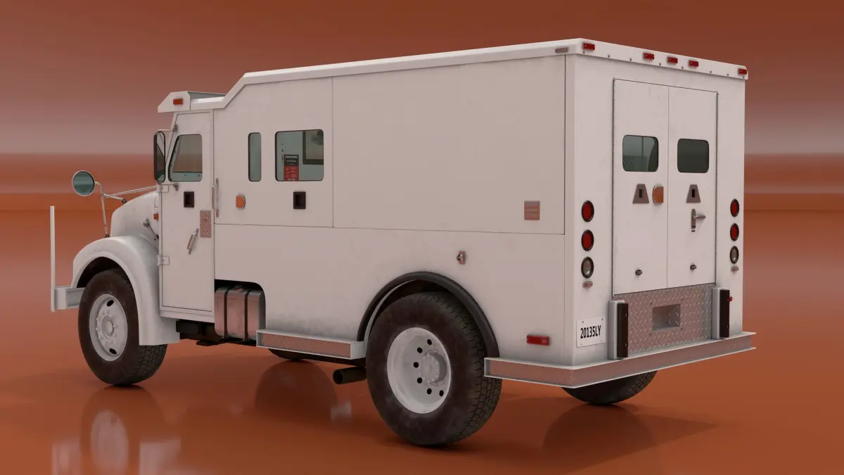 This model features a robust exterior with reinforced panels, secure locking mechanisms, and tinted ballistic glass. The vehicle is equipped with multiple access points, including reinforced doors and compartments for easy loading and unloading. Its design emphasizes security and durability, making it suitable for high-risk scenarios.
