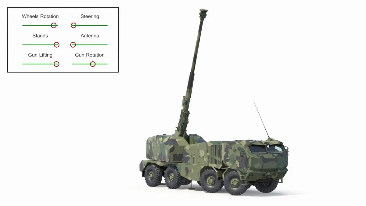 Armored Self Propelled Artillery Unit 155mm Rigged is fully rigged and is ready to be animated. You can easily position it the way you need or animate it the way your project requires using helpers in 3D Studio Max. See the turntable to get an idea of how rigging works. The pose of the model on the render images is an example and can be recreated using rig, it is not initially included into the product.