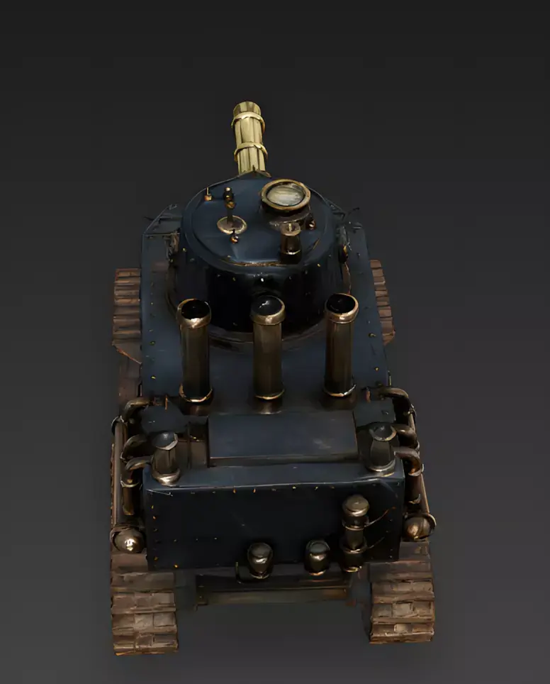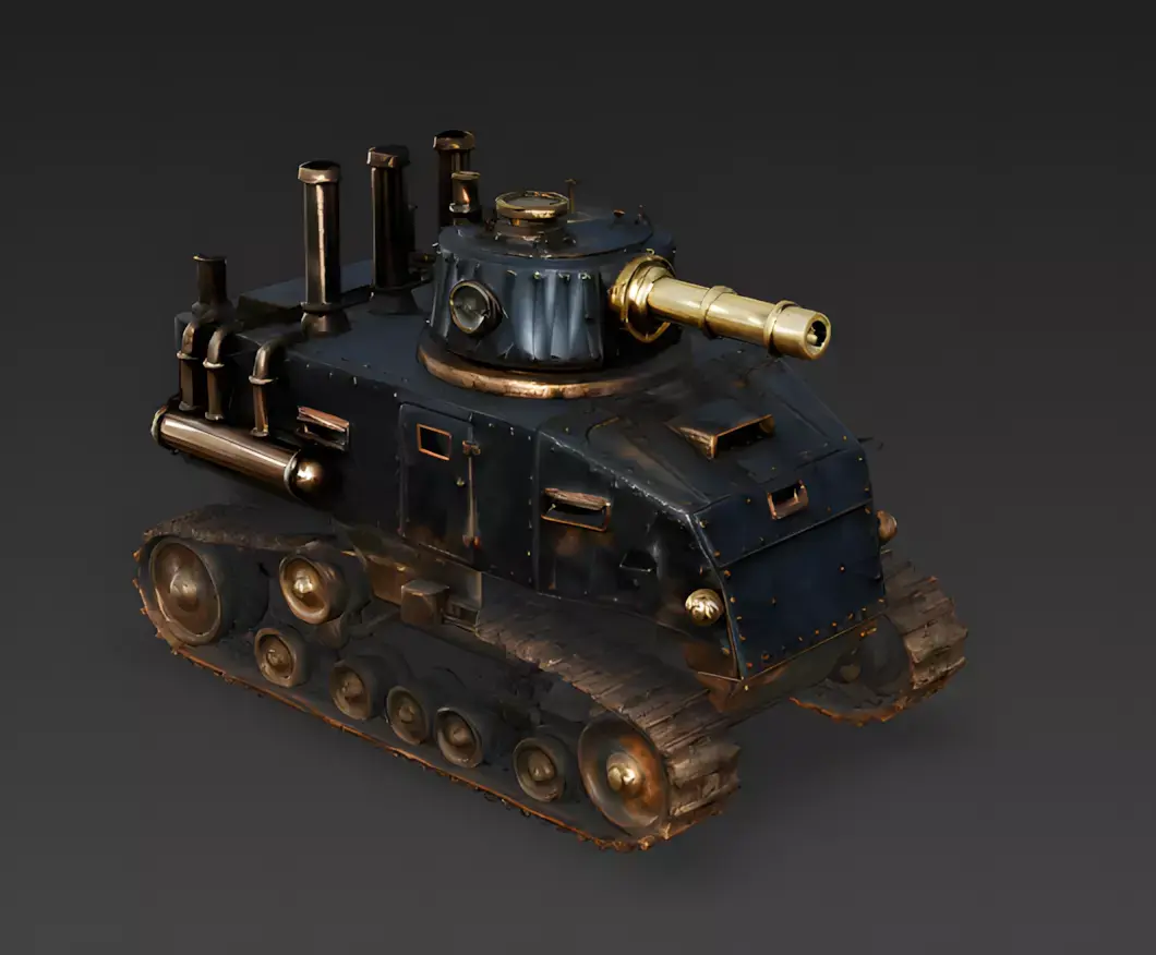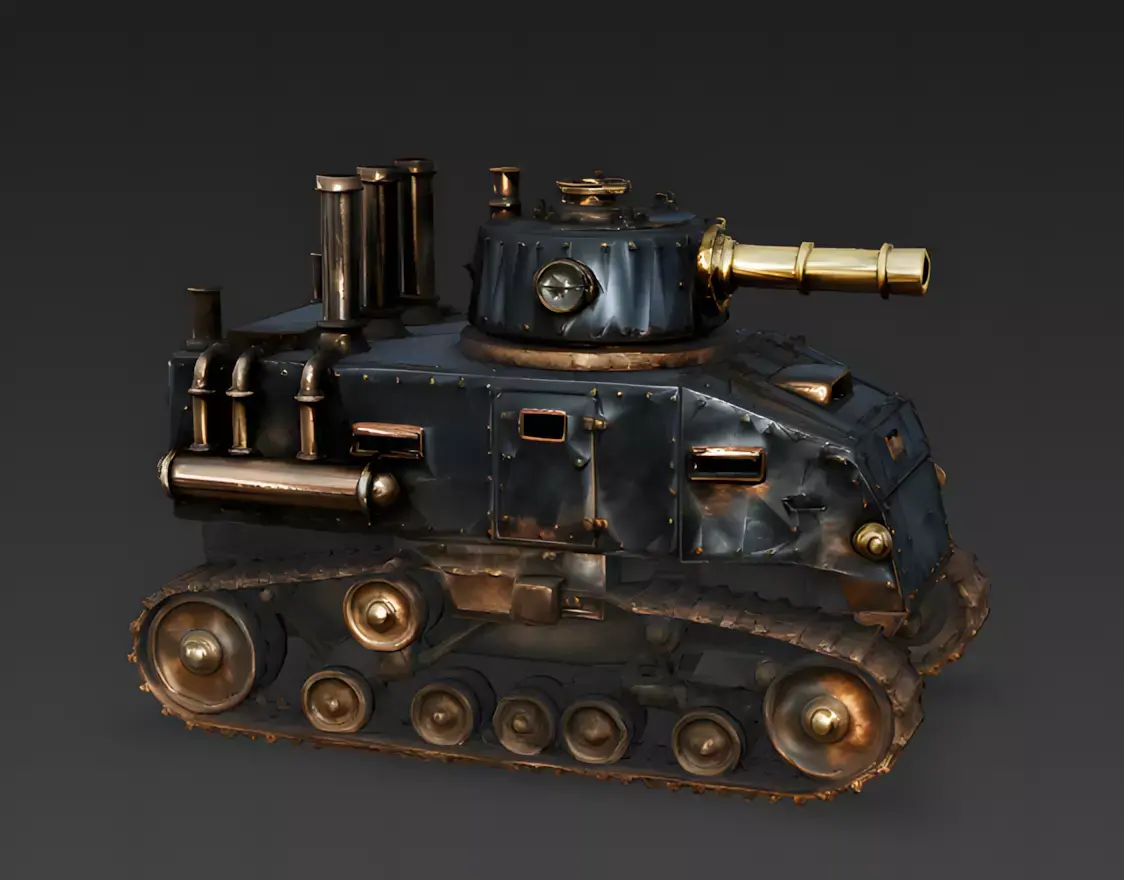 The Overall Concept This asset is a Steam-Tank, a fantasy combat vehicle that mixes the design of World War I tanks with Victorian steam technology. It is a slow, heavy mobile fortress designed to intimidate enemies with its raw metal bulk.