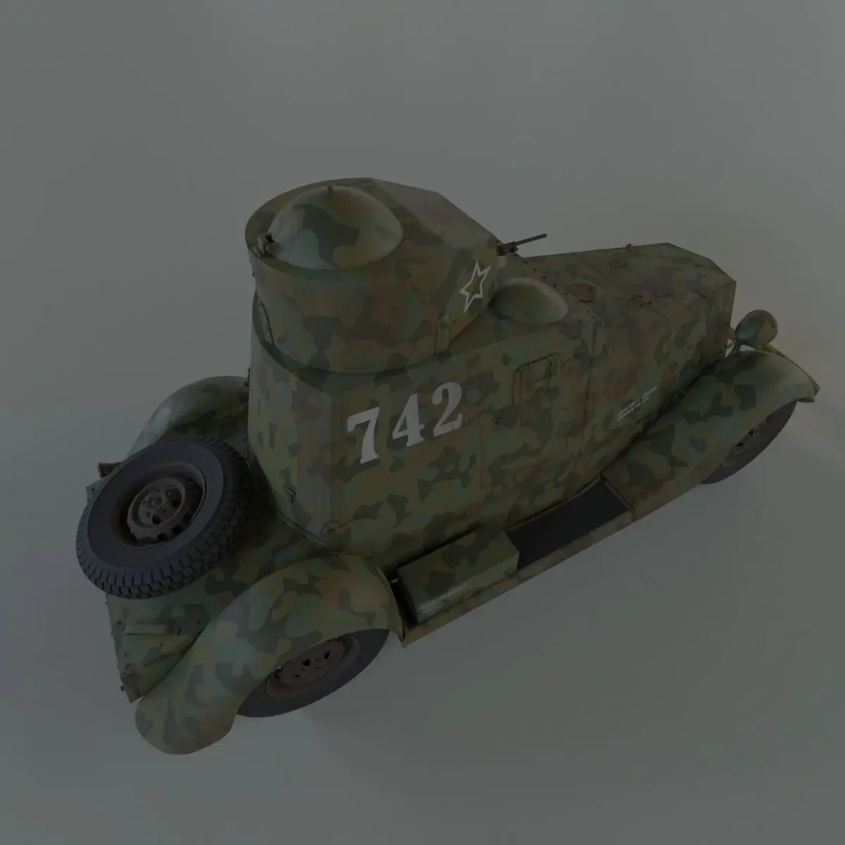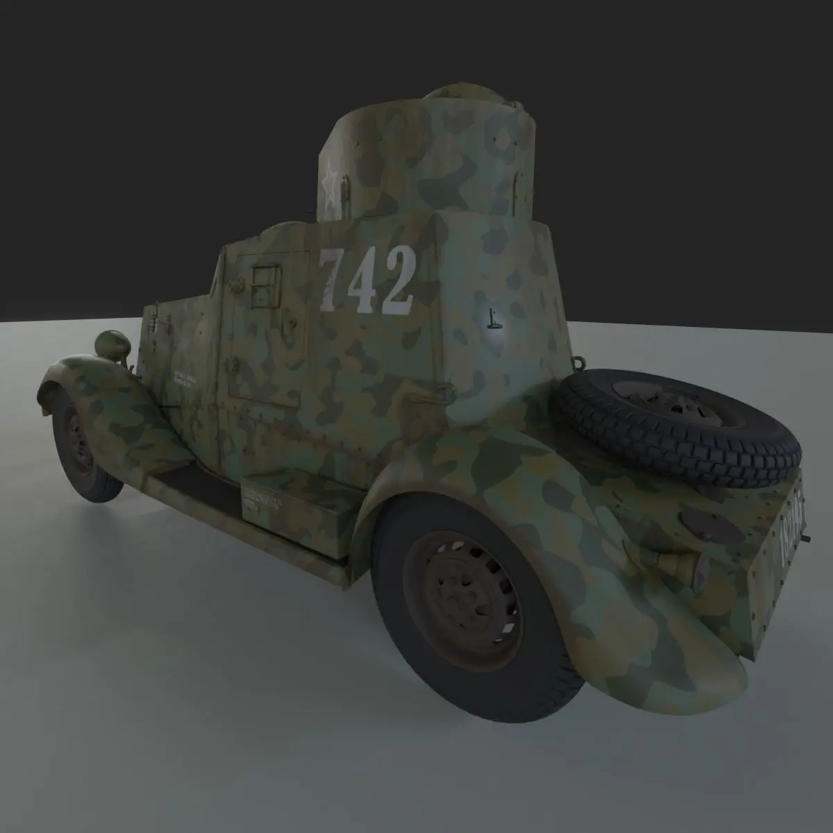 The FAI-M (Ford and A. Izhorskyi) is a WWII armoured car of Russian fabrication, built in 1938.Rendered in Cycles with smooth, subdivicion and solidify modifiers. The download includes 4 textures ( Color 4K, Bump 4K, Rough 2K and the painted texture to mix rust with color in 4K, for easy retexturing)It contains 5 objects: the ground plane, the body, understructure, wheels and gun.