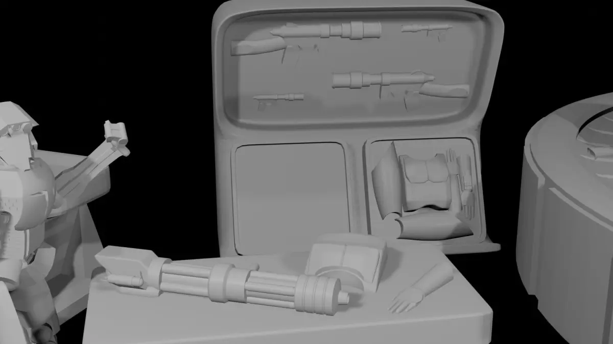 This room contains an armour dispenser, several weapons/gear racks, and two workbenches for weapon repair.