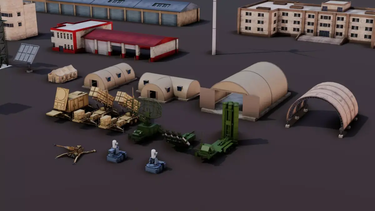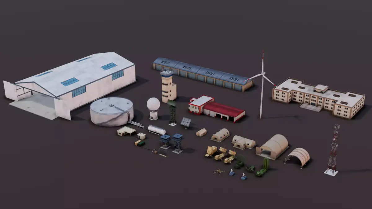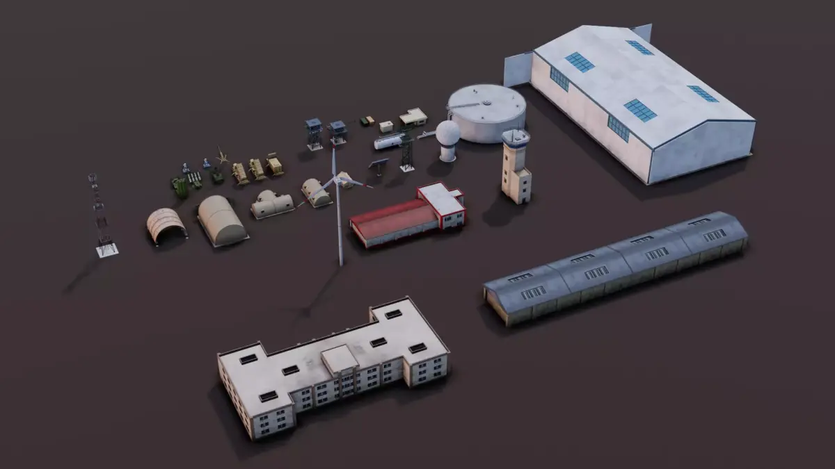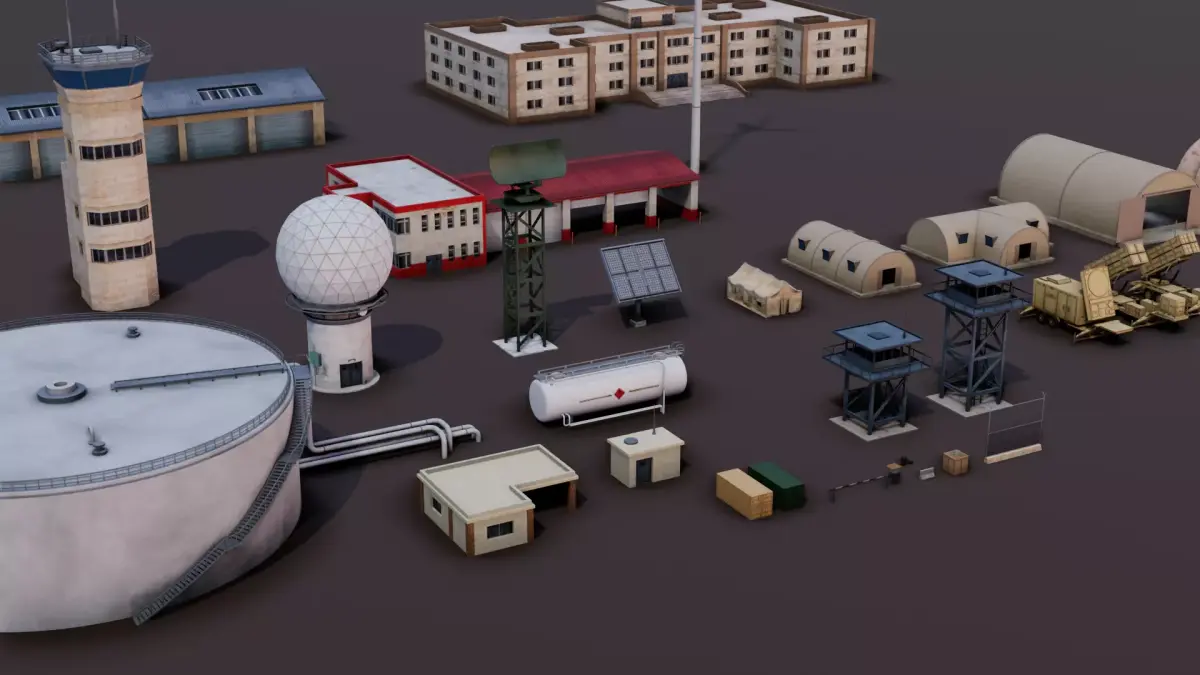 Included Objects:Buildings,guard towers,tents,fuel tanks,fences,radar units,antennas,watchtower,hangar,air defense systems and more as in preview images.